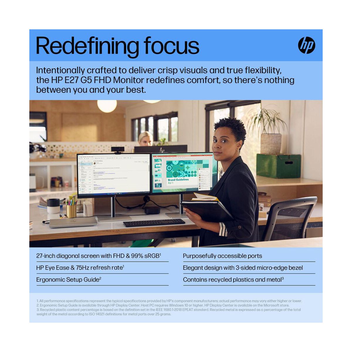 Intentionally crafted to deliver crisp visuals, personalized comfort, and true flexibility, the HP E27 G5 FHD Monitor redefines comfort, so there's nothing between you and your best. Stylishly designed with the planet in mind, this display is the perfect fit for both the office and home. When the difference is in the details, this 27-inch diagonal FHD monitor displays the clarity you need to stay focused on the task at hand. With rich 99% sRGB color depth and IPS technology, you’ll see clear, vivid colors across wide viewing angles.