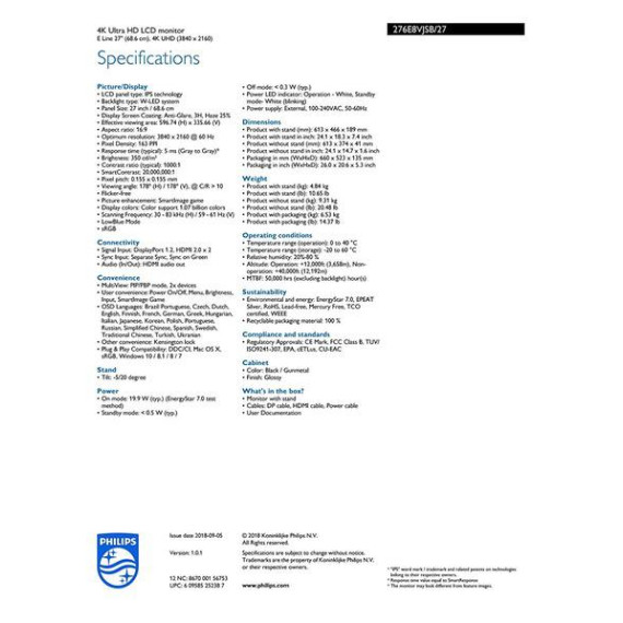 Philips 276E8VJSB 27" Monitor, 4K UHD 3840x2160 IPS, 1 Billion+ Colors, UltraNarrow Borders, LowBlue, MultiView, DispalyPort/2xHDMI 2.0