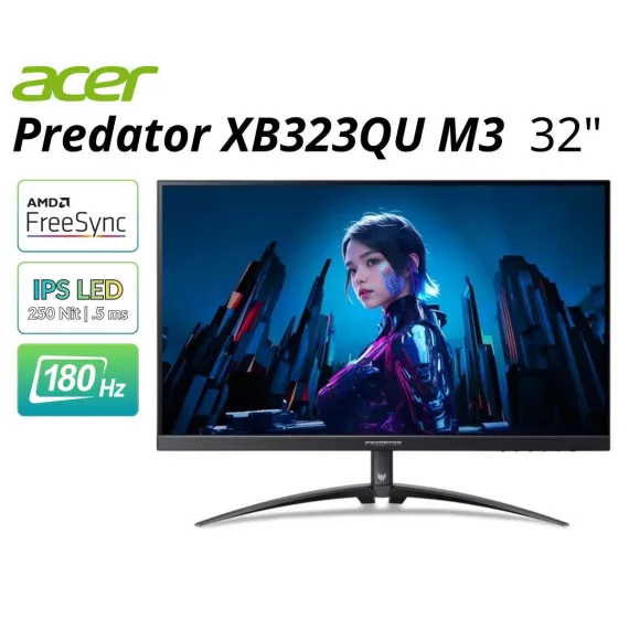 The manufacturer-refurbished Acer Predator XB323QU M3 delivers premium gaming performance through its expansive 31.5-inch IPS panel display. This sophisticated monitor features Wide Quad High Definition (WQHD) resolution of 2560 x 1440, offering four times the clarity of standard HD displays. The screen boasts an ultra-fast 500 microsecond response time and impressive 180Hz refresh rate, ensuring smooth, ghost-free gaming experiences with minimal motion blur. With a 100,000,000:1 dynamic contrast ratio and 250-nit brightness, the display produces vivid visuals with deep blacks and bright whites across its 16:9 aspect ratio screen. The monitor's robust connectivity includes one DisplayPort and two HDMI ports for versatile input options. Its sleek black design measures 28.2 inches wide, 16.8 inches high, and 3.5 inches deep, weighing a manageable 7.5 pounds. The display supports VESA mounting (100 x 100) for flexible installation options. As an IPS panel, it delivers superior color accuracy and wide viewing angles, making it ideal for both competitive gaming and content creation. This refurbished unit combines professional-grade gaming features with reliable performance in a premium display package. This is a manufacturer refurbished product.