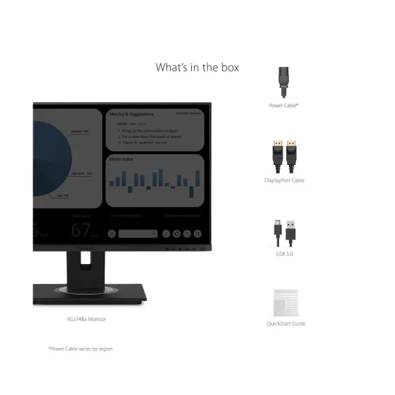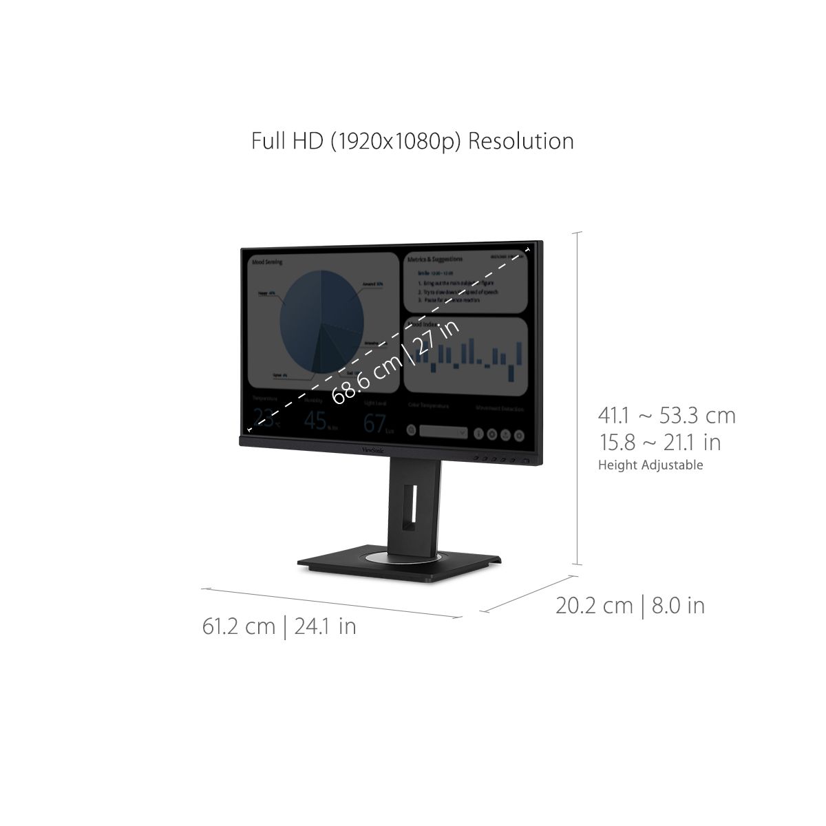 Designed for the modern day office, the ViewSonic® VG2748a monitor delivers an efficient end-to-end enterprise experience. Featuring SuperClear® IPS panel technology and 1080p resolution, this 27" monitor delivers crisp and clear images from nearly any viewing angle. The 3-sided thin bezel design provides a seamless viewing experience for multi-monitor setups. For enhanced productivity, an advanced ergonomic design offers a wide range of customizable adjustments for maximum comfort including pivot, swivel, height adjustment, and tilt. With the ability to tilt an impressive 40-degrees, the VG2748a is ideal for users who prefer to work while standing up, as well as for those who like to use their screen for group discussions. Versatile connectivity options include HDMI, DisplayPort, VGA, and USB. This monitor is also shipped in eco-friendly biodegradable packaging, along with an easy-to-install quick release stand that makes for simple out-of-the box setup. The quick release stand also includes an integrated client mount and cable management features, making this monitor perfect for deployment in cloud-based environments.. ***** Manufacturer Refurbished Product. Please note that this is a pre-owned item. - Manufacturer Refurbished