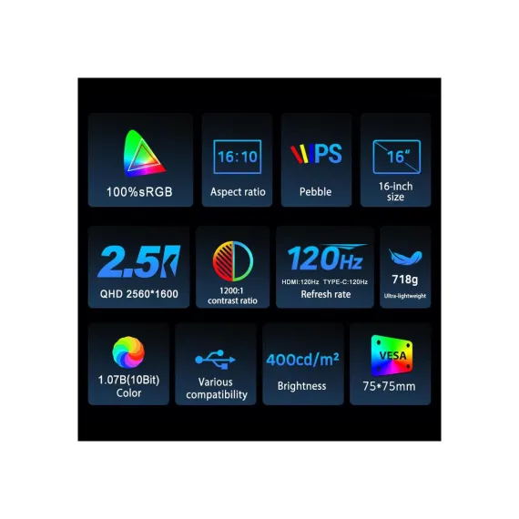 Step into sharper detail and smoother motion with the UPERFECT 16" 2.5K portable monitor. Built for creators, gamers, and multitaskers alike, its 2560×1600 QHD resolution and 16:10 aspect ratio give you more screen space where it matters—vertically. Enjoy ultra-fluid visuals with a 120Hz refresh rate via USB-C & HDMI