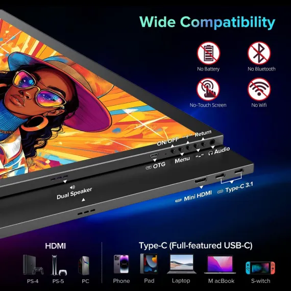 Take your setup beyond the limits of your laptop screen. Whether you're a creative editing photos on a MacBook, a gamer battling on a PS5, or a developer monitoring builds via ATEM Mini Pro, this 18.4" 4K portable display is your dynamic second screen. The ultra-detailed UHD resolution and rich color depth give your visuals the space and clarity they deserve, while the sturdy VESA mount and minimalist profile blend effortlessly into any workspace. Designed for both performance and portability, it connects seamlessly via USB-C or mini HDMI and powers through your day—with a little help from an external power source. Built-in speakers and OTG support make it a one-stop hub for both work and entertainment.