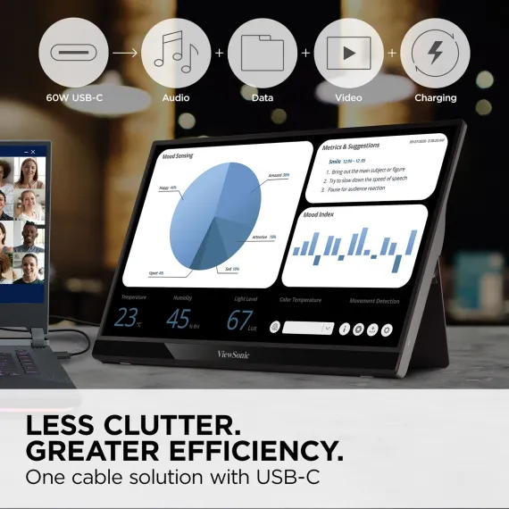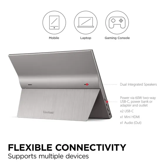 The ViewSonic VG1655 is a portable 15.6-Inch monitor designed for productivity on the go. Built for business travelers, remote workers, and digital nomads, the VG1655 can serve as a complementary screen to a laptop or tablet for boosted productivity. With an anti-glare screen and Full HD 1080p resolution, this monitor delivers a crystal-clear viewing experience so users can see more and do more for a more efficient workflow. A USB Type-C port enables quick and easy transmission of video, and audio. A second USB Type-C port also delivers up to 60W of two-way power: a connected laptop can power the VG1655, OR the VG1655 can power a connected laptop via a USB-C power bank or AC adapter and outlet. Measuring less than an inch thick and weighing under two pounds, the ultra-slim VG1655 perfectly fits into any bag, briefcase, or backpack so you can work wherever life takes you.....