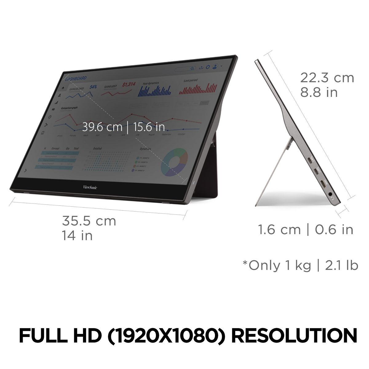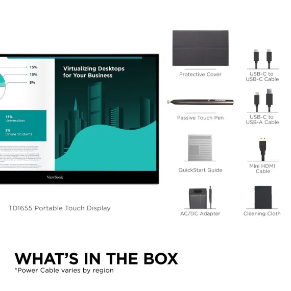 The ViewSonic TD1655 is a portable 15.6-Inch touch display designed for productivity on the go. Built for business travelers, remote workers, and digital nomads, the TD1655 can serve as a complementary touchscreen to a laptop or tablet for boosted productivity. With an anti-glare screen and Full HD 1080p resolution, this touch display delivers a crystal-clear viewing experience so users can see more and do more for a more efficient workflow. In addition, with a 10-point projective capacitive touchscreen and included stylus pen, the TD1655 delivers a smooth and natural writing experience and streamlined navigation with every tap, pinch, and swipe. A USB Type-C port enables quick and easy transmission of video, and audio. A second USB Type-C port also delivers up to 60W of two-way power: a connected laptop can power the TD1655, OR the TD1655 can power a connected laptop via a USB-C power bank or AC adapter and outlet. Measuring less than an inch thick and weighing only two pounds, the ultra-slim TD1655 perfectly fits into any bag, briefcase, or backpack so you can work wherever life takes you.