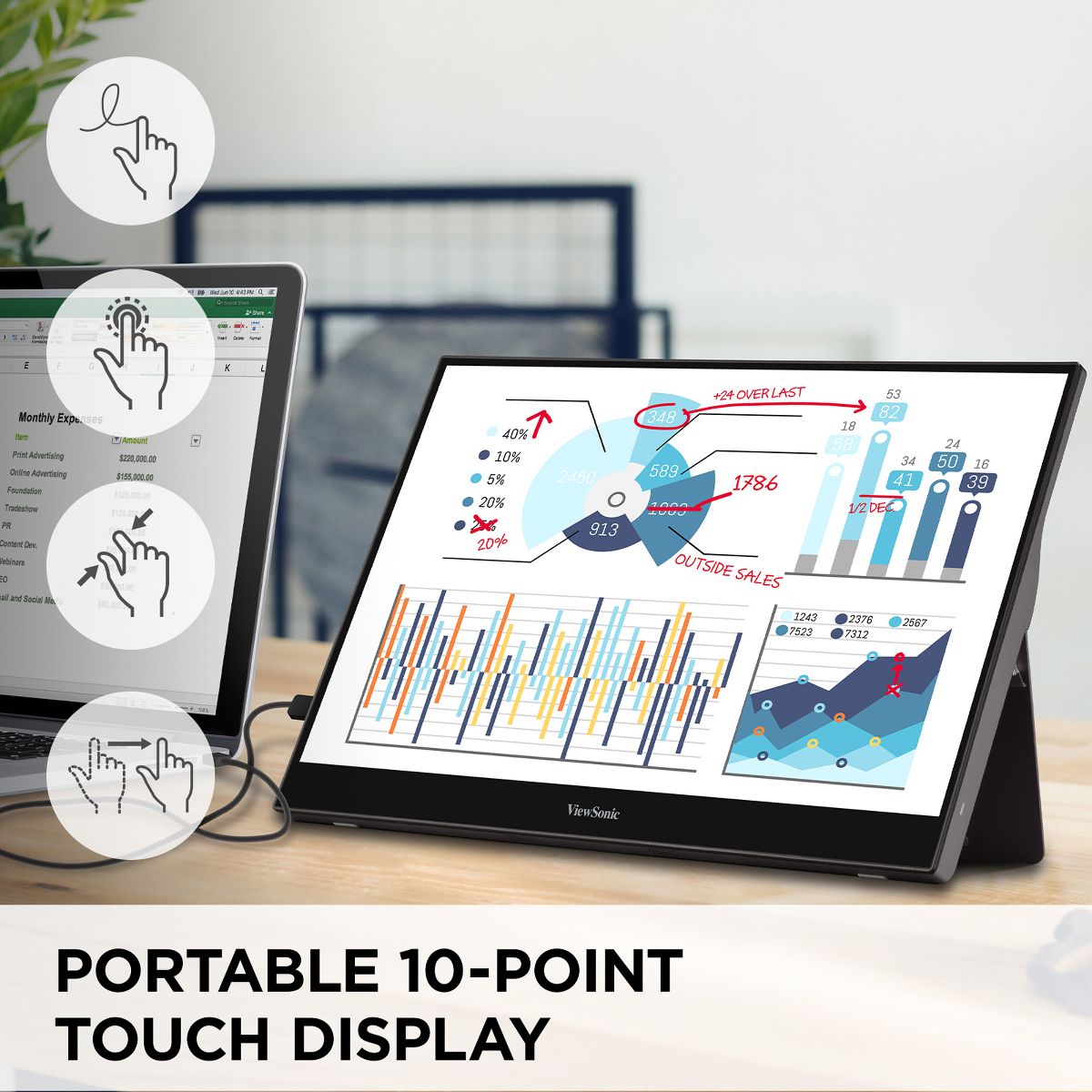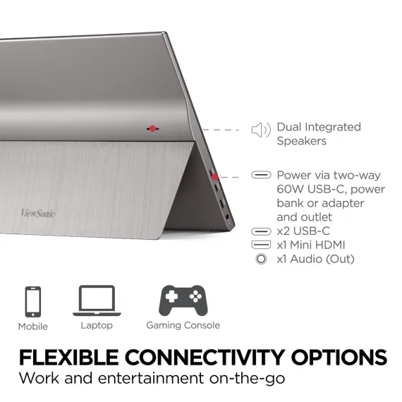 ViewSonic 15.6 Inch 1080p Portable Monitor with IPS Touchscreen, 2 Way Powered 60W USB C, Eye Care, Dual Speakers, Built in Stand with Cover (TD1655)