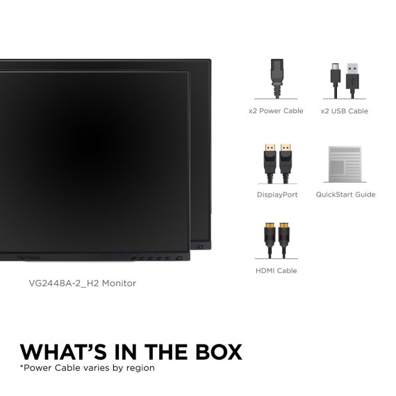 Skyrocket productivity and optimize your workflow with the ViewSonic® VG2448a-2_H2 dual monitor pack. Featuring hassle-free installation and long-term reliability, this dual monitor solution substantially lowers your total cost of ownership. And with biodegradable packaging and VESA-compatible mounting, you can cut easily cut down on waste and do your part to contribute to a greener planet. Featuring a 3-sided ultra-thin bezel, the VG2448a-2_H2 provides a seamless multi-monitor viewing experience that dramatically increases visual clarity and helps to reduce eye strain. And with SuperClear® IPS panel technology, you can enjoy wide-angle viewing and vibrant, true-to-life colors. Connect your favorite devices with ease using the HDMI, DisplayPort, VGA and USB inputs. Upgrade your setup and enhance productivity with the ViewSonic VG2448a-2_H2 dual monitor pack today.