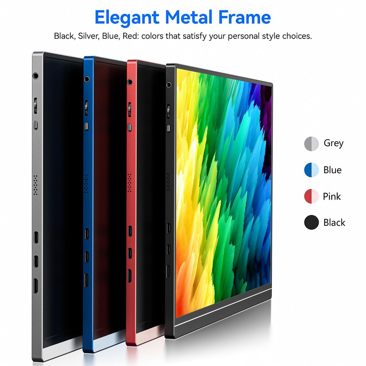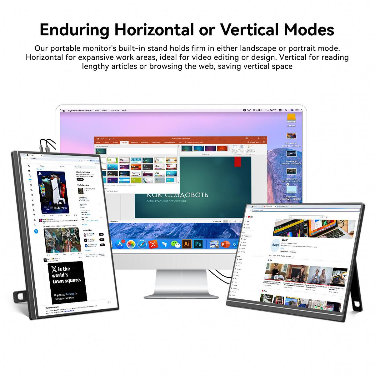 This portable monitor enhances work efficiency by serving as a second screen for multitasking across various applications like business presentations, learning, design, and more. Its 16-inch IPS screen with 178° wide viewing angle, 100% sRGB, and 1200:1 contrast ratio color ensures accuracy and smooth motion with FreeSync technology. The built-in stand adjusts from 0 to 75 degrees and supports landscape/portrait modes. Made from aluminum in black, it matches any setting. At only 0.36 inches thick and 1.58 pounds, it's perfect for travel, with 300CD/M2 brightness for outdoor use. It features two USB Type-C ports, one Mini-HDMI port, dual speakers, and an intuitive control wheel for seamless compatibility and easy setup with PCs, Macs, smartphones, and gaming consoles.