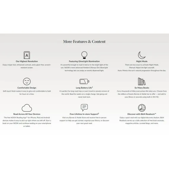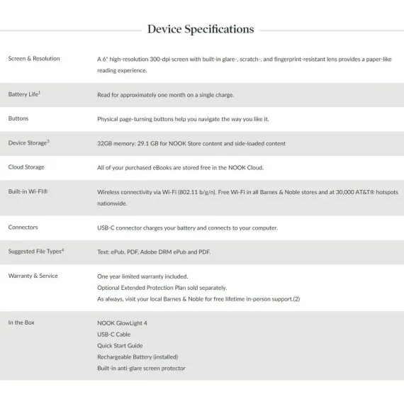 A 6 inch high-resolution 300-dpi screen with built-in glare- scratch- and fingerprint-resistant lens provides a paper-like reading experience. It’s powerful enough to read in bed or in the bright light of the sun. NOOK’s most advanced Ambient (Always-On) GlowLight technology lets you enjoy an evenly dispersed light. Carry thousands of titles everywhere life takes you. Choose from the millions of books Barnes & Noble has to offer and add to your library in seconds using built-in Wi-Fi.