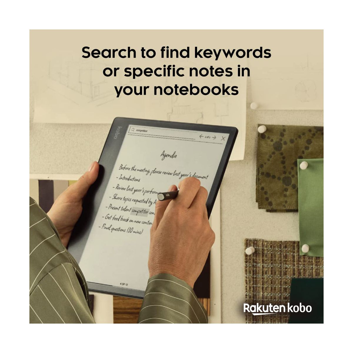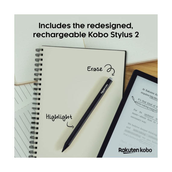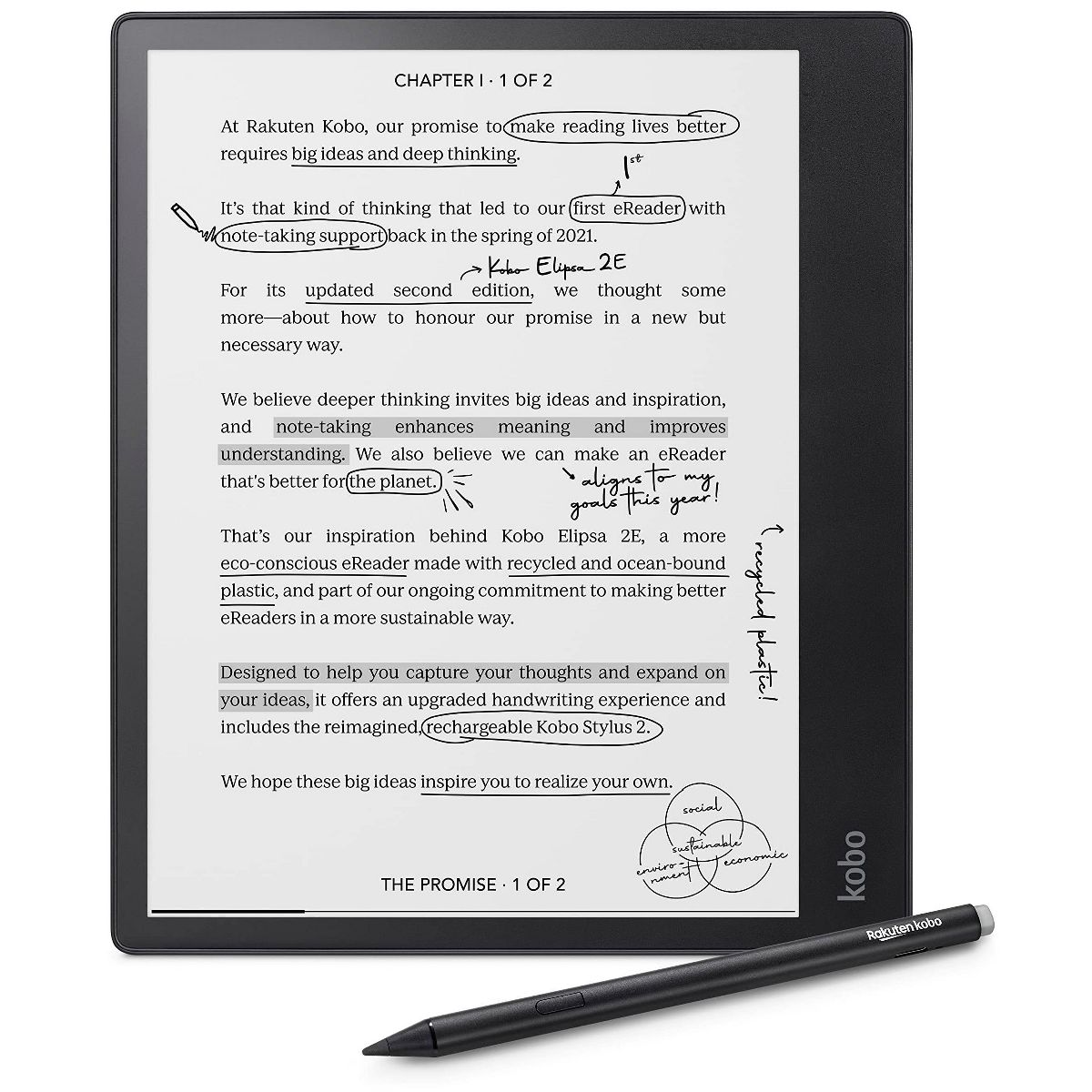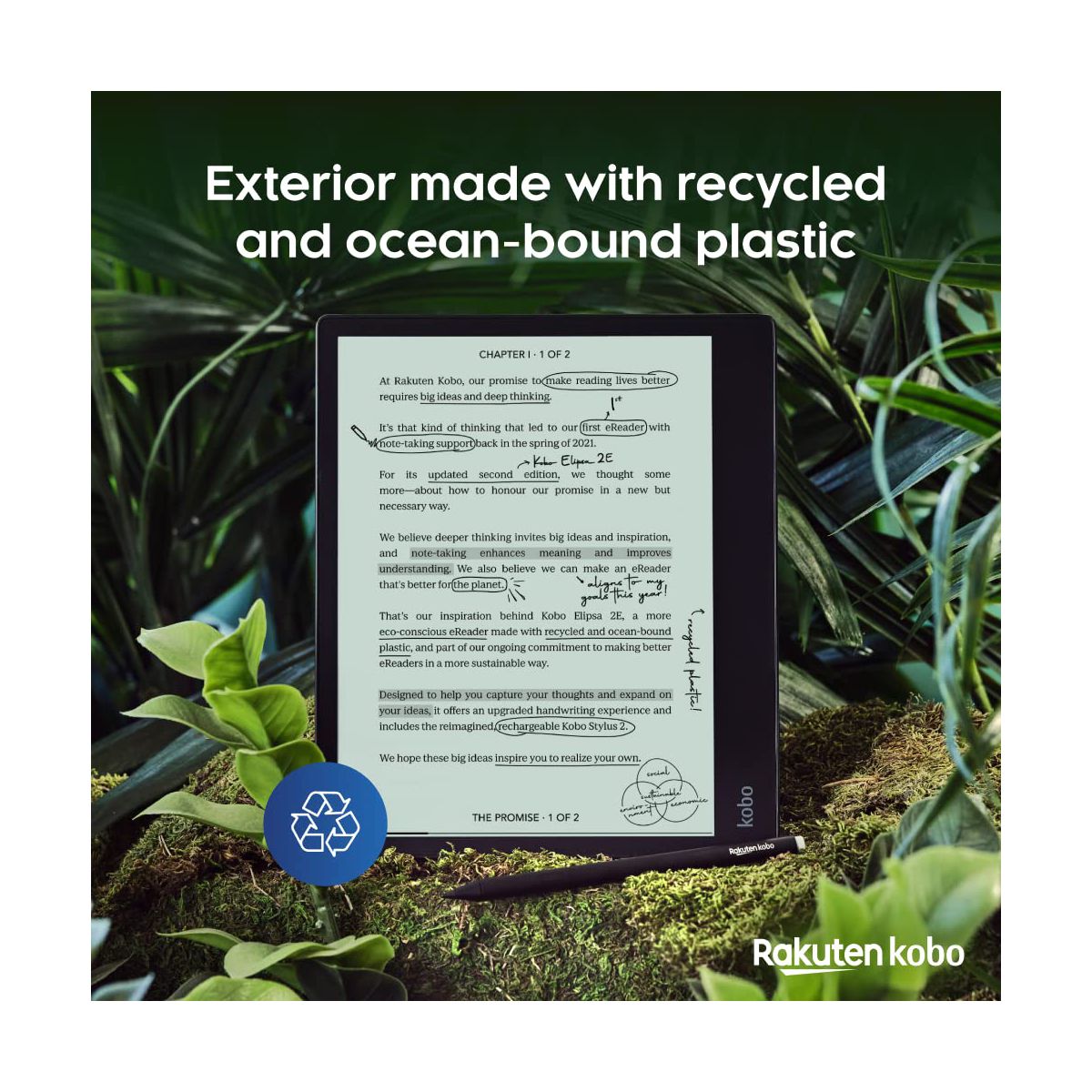 Made for big thinkers and bundled with Kobo Stylus 2, the newly upgraded Kobo Elipsa 2E is designed to help you focus and organize your thoughts. Write directly on eBooks and PDFs with Kobo Elipsa 2E's improved note-taking experience. Create and organize notebooks that do more than paper, and export them with integrated cloud services. Read and write comfortably on a 10.3" touchscreen with ComfortLight PRO to reduce blue light and ease eyestrain. Listen to Kobo Audiobooks with Bluetooth wireless technology. With 32GB of storage, carry your entire library and all your notes wherever you go. Made with recycled and ocean-bound plastic, the eco-conscious Kobo Elipsa 2E is designed to capture all your big thinking.