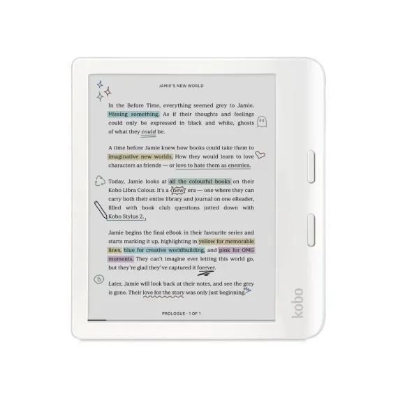Introducing our most inspiring eReader yet: the new Kobo Libra Colour. Bring magic to your margins by annotating your pages, organizing your thoughts, and highlighting inspiring lines, all in color. With Kobo Stylus 2 compatibility, you can dive deeper into your favorite stories by marking up meaningful moments and highlighting powerful passages in the eBooks you love. (Stylus 2, AC adapter, and SleepCovers are optional accessories, sold separately.) Includes USB-C sync/charge cable.