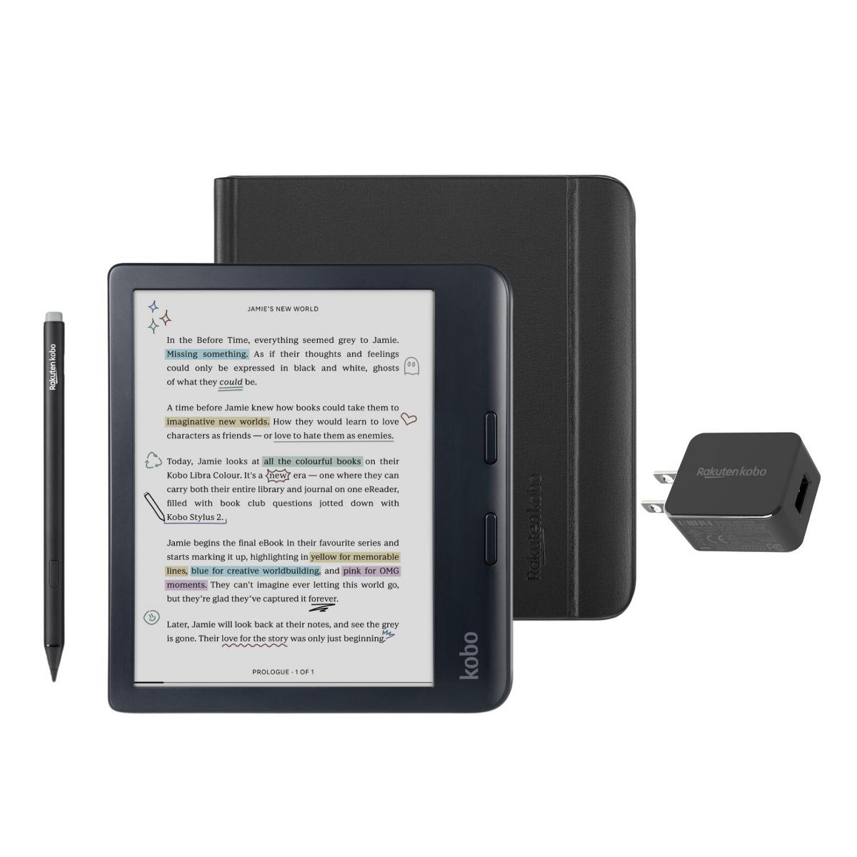 Introducing our most inspiring eReader yet: the new Kobo Libra Colour. Bring magic to your margins by annotating your pages, organizing your thoughts, and highlighting inspiring lines, all in color. With Kobo Stylus 2 compatibility, you can dive deeper into your favorite stories by marking up meaningful moments and highlighting powerful passages in the eBooks you love. Personalize your Kobo Libra Colour by choosing the case bundle that best matches your style. SleepCovers are available in Black, Butter Yellow, Dusk Blue, and Garden Green. Notebook SleepCovers are available in Sand Beige and Black. A Clear shell case is also available. Bundle options also allow adding the AC adapter and/or Stylus 2.