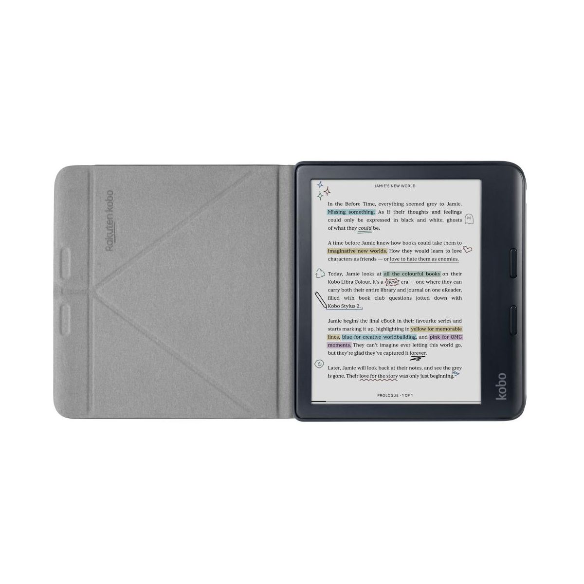 Introducing our most inspiring eReader yet: the new Kobo Libra Colour. Bring magic to your margins by annotating your pages, organizing your thoughts, and highlighting inspiring lines, all in color. With Kobo Stylus 2 compatibility, you can dive deeper into your favorite stories by marking up meaningful moments and highlighting powerful passages in the eBooks you love. Personalize your Kobo Libra Colour by choosing the case bundle that best matches your style. SleepCovers are available in Black, Butter Yellow, Dusk Blue, and Garden Green. Notebook SleepCovers are available in Sand Beige and Black. A Clear shell case is also available. Bundle options also allow adding the AC adapter and/or Stylus 2.