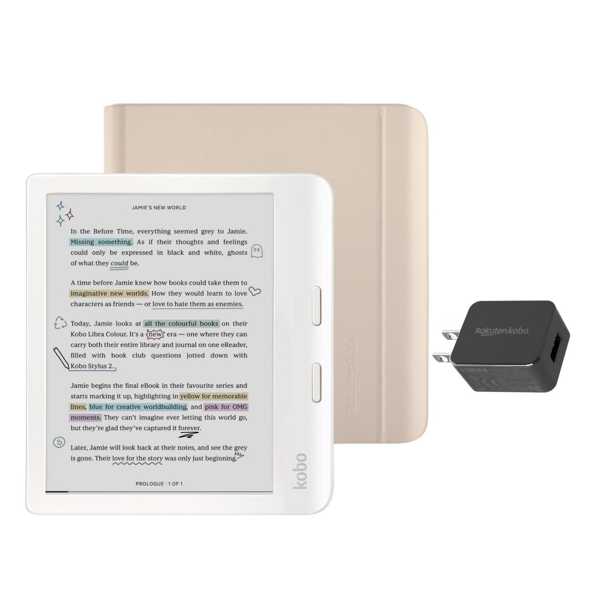 Introducing our most inspiring eReader yet: the new Kobo Libra Colour. Bring magic to your margins by annotating your pages, organizing your thoughts, and highlighting inspiring lines, all in color. With Kobo Stylus 2 compatibility, you can dive deeper into your favorite stories by marking up meaningful moments and highlighting powerful passages in the eBooks you love. Personalize your Kobo Libra Colour by choosing the case bundle that best matches your style. SleepCovers are available in Black, Butter Yellow, Dusk Blue, and Garden Green. Notebook SleepCovers are available in Sand Beige and Black. A Clear shell case is also available. Bundle options also allow adding the AC adapter and/or Stylus 2.