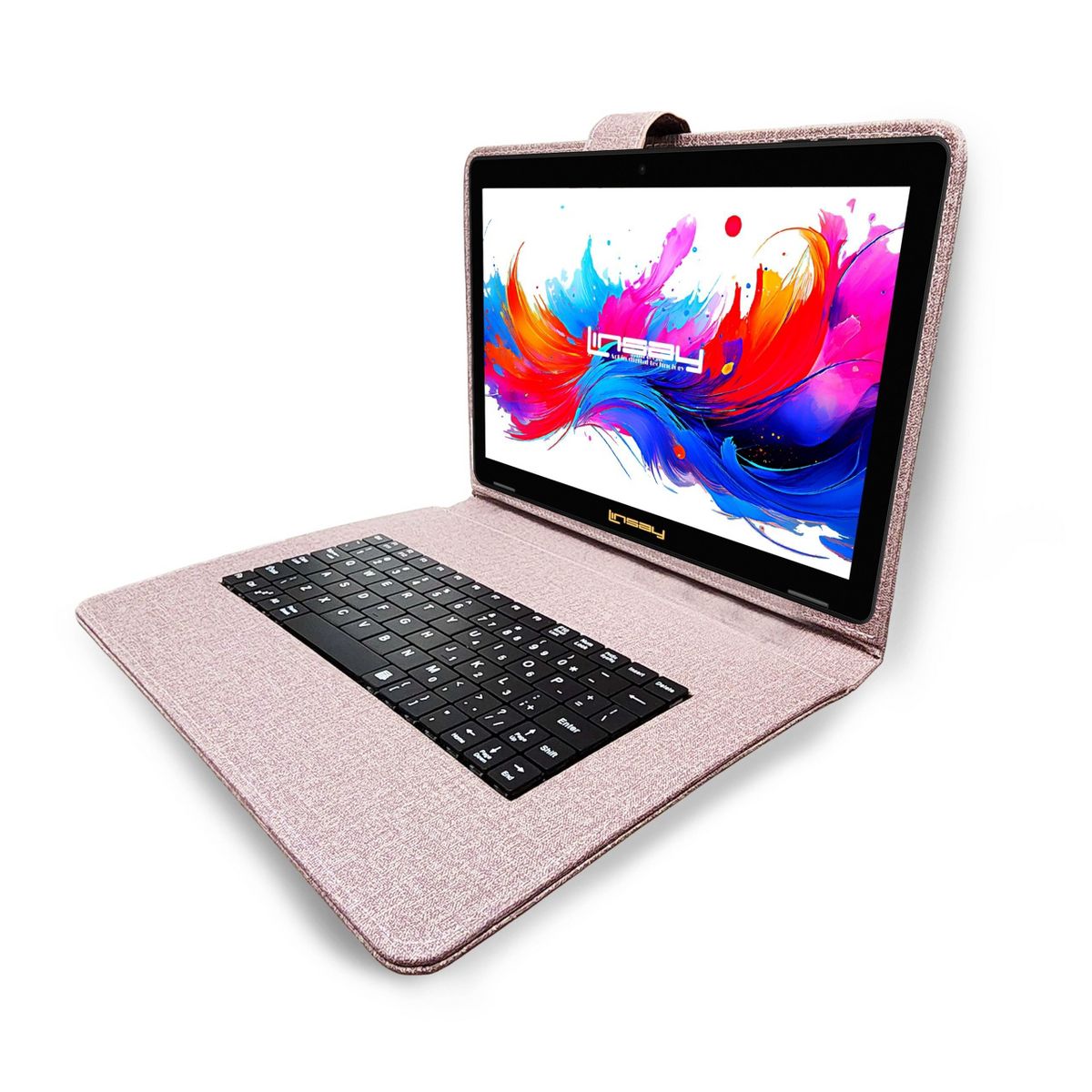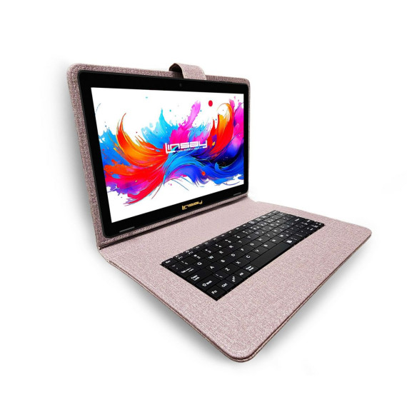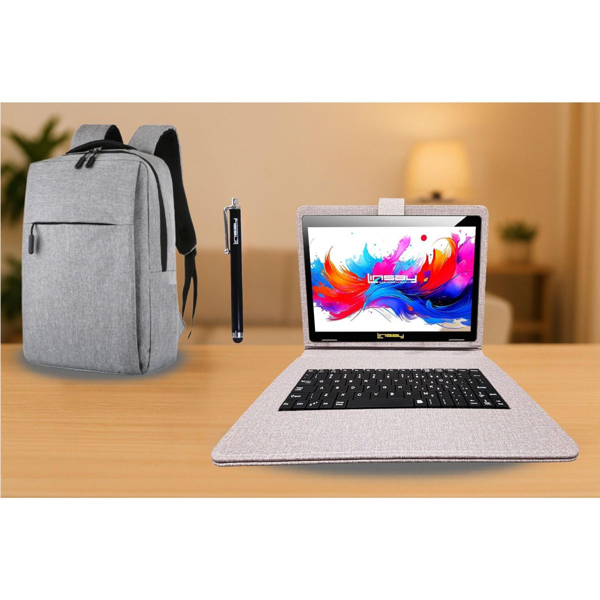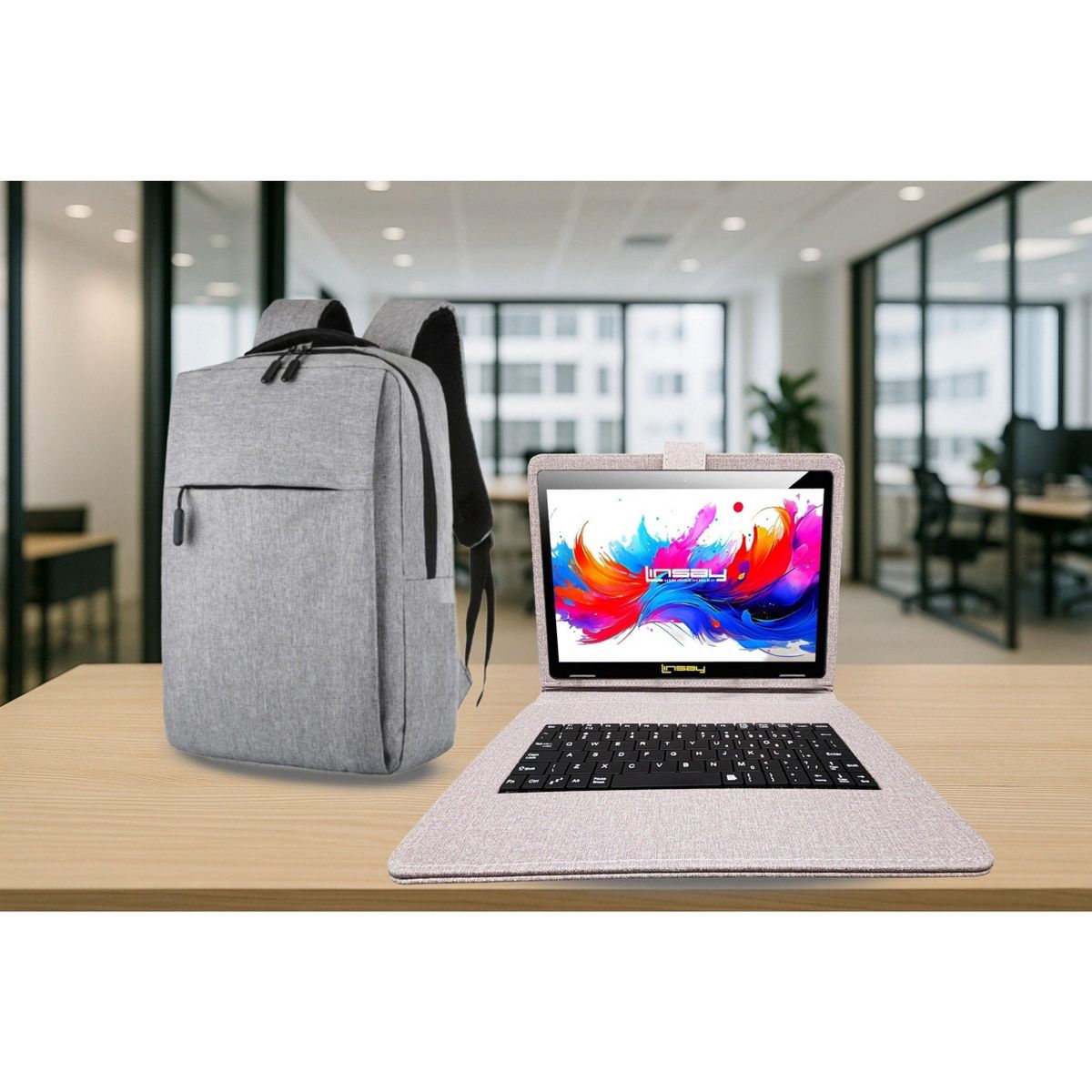LINSAY® 10.1" Octa Core 256GB STORAGE Android 15 BUNDLE with PURPLE DESIGNER CLOTH KEYBOARD CASE and STYLISH COMPACT BACKPACK