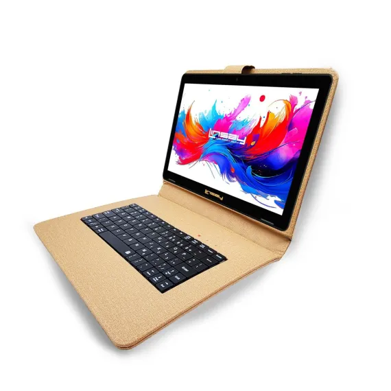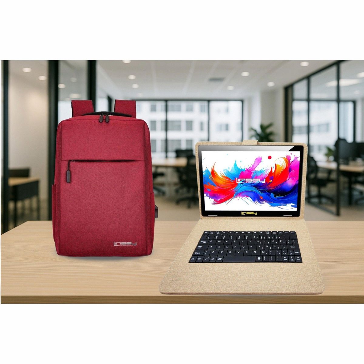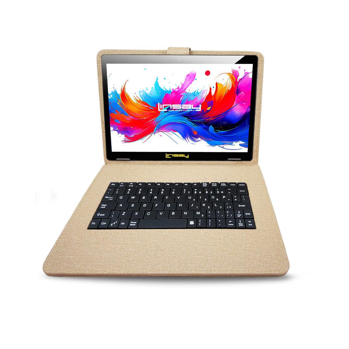 LINSAY® 10.1" Octa Core 256GB STORAGE Android 15 BUNDLE with SAND DESIGNER CLOTH KEYBOARD CASE and STYLISH COMPACT BACKPACK