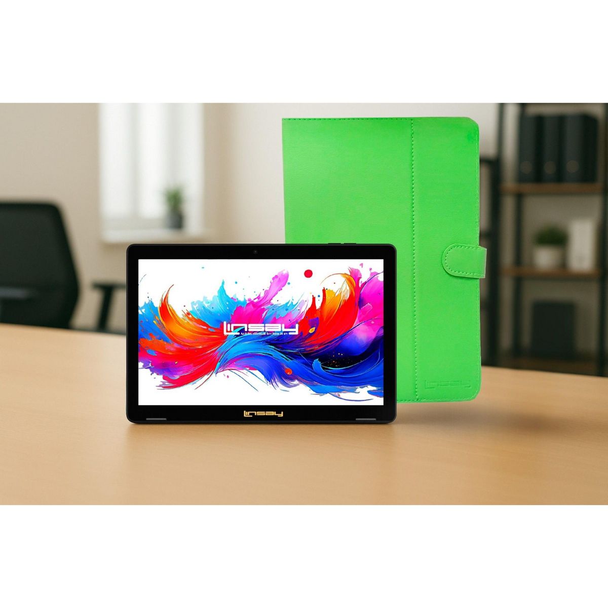 LINSAY 10.1" Octa Core 256GB Storage Android 15 Tablet with Green Leather Case