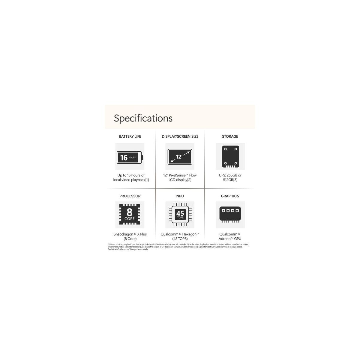 Please note this product releases on May 20th, 2025 and will not be made available until that date. Get the flexibility you want and the speed you need with Surface Pro 12", a Copilot+ PC and the most versatile Surface. Use it as a tablet. Express yourself with touch, voice, and Surface Slim Pen. Or click in the Surface Pro 12" Keyboard for a full laptop experience. And you can wear your style on your laptop with a choice of colors and finishes. When you have all this, plus advanced AI capabilities in one ultra-thin and light device, the power to go beyond what you thought possible is yours. Copilot+ PC. A new AI era begins Turn your ideas from text prompts into generated artwork. With Recall search across time to find the content you need. Understand new languages instantly with Live Captions. Copilot+ PCs powered by the Snapdragon X Plus processor come with 45 Trillion Operations Per Second of NPU power, and theyre all set to transform the way you create, find and communicate. Brilliant Display Immersive Brilliance or Incredible image quality The 12" PixelSense Flow touchscreen offers a vibrant and immersive viewing experience. All-day Energy Up to 16 hours of battery life for local video playback for uninterrupted streaming Power up Built with the latest Qualcomm Snapdragon X Plus 8 Core processors, Surface Pro delivers powerful performance and AI accelerated power. Turbocharged NPU Surface Pro features the Qualcomm Hexagon NPU that delivers up to 45 TOPs designed to accelerate AI experiences Express your style Surface Pro comes in three new colors Violet, Ocean, and Platinum. The ports you need Charge on-the-go, transfer data fast, or create the ultimate desktop set up with two USB-C 3.2 ports. Always charged and ready Store and charge Surface Slim Pen directly in the new pen storage area on the back of Surface Pro. Designed to be a laptop or a tablet The iconic built in 165-degree fluid kickstand delivers flexibility at any angle. Laptop Productivity When paired with Surface Pro 12" Keyboard, Surface Pro turns into a full thin and light Windows laptop with a comfortable typing and touchpad experience. You are the security Windows Hello is a faster, more personal, more secure way to get instant access to your devices using only your facial recognition theres no password to remember. Productivity and efficiency, redefined Powered by Snapdragon X Plus 8 Core processors and a turbocharged NPU you can save time on daily tasks with exclusive Copilot+ PC experiences. What's in the box: Surface Pro 12", USB - C charging cable, No power adapter included, No keyboard included, Quick Start Guide, Safety and warranty documents.