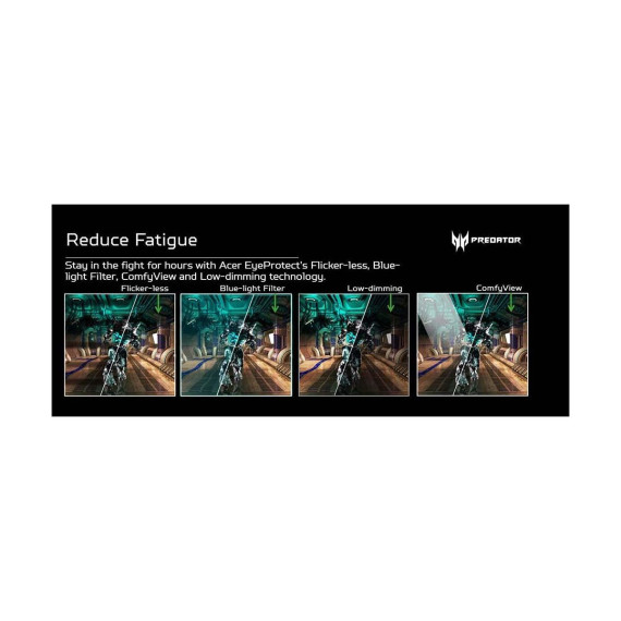 Stay in the fight for hours with Acer EyeProtect's Flicker-less, Bluelight Filter, ComfyView and Low-dimming technology.