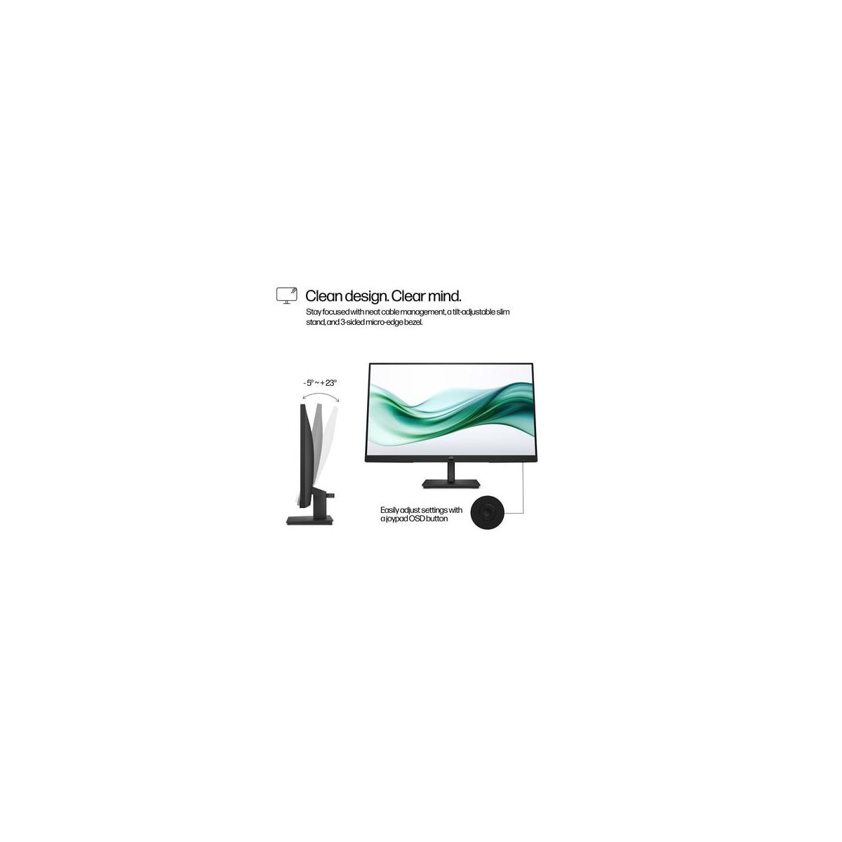 Overview - Expand your view and boost productivity with an additional 23.8 inches of workspace from this FHD monitor. Work in comfort with a crisp, smooth screen and simple design, so you can get more done everyday. Tilt What's in the box? - Monitor; HDMI cable; Warranty card; Quick Setup Poster; AC power cord Disclaimers - All performance specifications represent the typical specifications provided by HP's component manufacturers; actual performance may vary either higher or lower. 100 Hz refresh rate can be supported via HDMI only. 60 Hz refresh rate with VGA. - Based on US EPEAT® registration according to IEEE 1680.1-2018 EPEAT®. EPEAT® status varies by country. - 100% outer box/corrugate cushion packaging made from sustainably sourced certified and recycled fibers. Fiber cushions made from 100% recycled wood fiber and organic material. Any plastic cushions are made from >90% recycled plastic. Excludes plastic bags and plastic foam sheeting.
