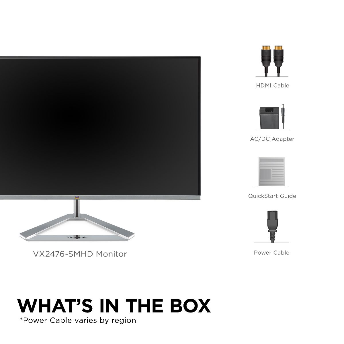 Style and substance go hand-in-hand with the ViewSonic VX2476-smhd 24" (23.8" viewable area) Full HD monitor. SuperClear IPS panel technology, wide viewing angles, and best-in-class screen performance deliver outstanding visual clarity great for vibrant entertainment and gaming. A premium ID includes an ultra-slim profile, unique desktop stand, and a sleek edge-to-edge frameless screen, that when combined with vivid 1920x1080 resolution and dual speakers, deliver an immersive viewing experience for home entertainment and multimedia applications. Versatile HDMI, DisplayPort, and VGA inputs keep you connected to your favorite devices, while the modern, flush-mount frameless bezel design makes a standout statement in any home. ***** Manufacturer Refurbished Product. Please note that this is a pre-owned item. - Manufacturer Refurbished