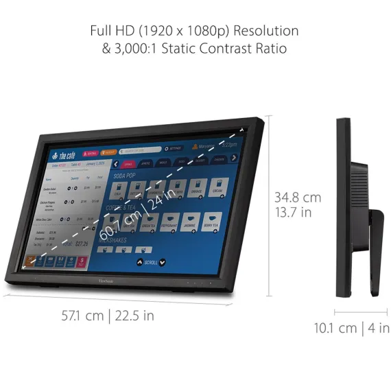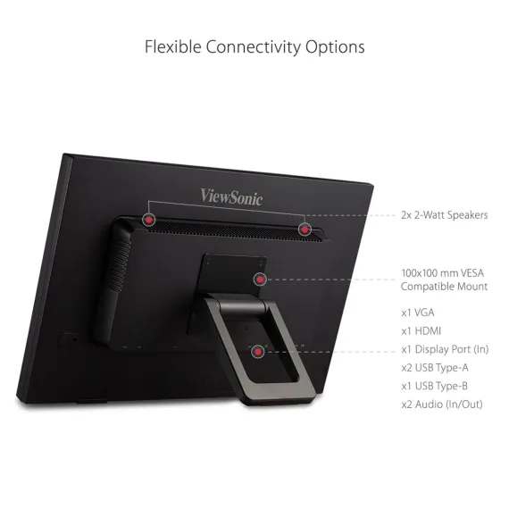 Great for public kiosks, POS displays, and other retail and commercial applications, the ViewSonic TD2423d is a 24” touch display with 10-point IR touch technology that lets users pinch, zoom and swipe for fast and intuitive navigation. With Full HD 1920x1080 resolution, 3000:1 static contrast ratio and 7H screen hardness, the TD2423d delivers sharp and bright images combined with durability for high-traffic applications. Flexible connectivity options include HDMI, DisplayPort, VGA, DVI, and a USB hub to connect your peripherals and accessories. VESA-mount compatibility offers additional convenience and flexibility for 3rd party stands and mounts. What’s more, ViewSonic’s exclusive ViewMode feature provides intuitive presets that deliver optimized screen performance in different applications. In addition, Flicker-Free technology and a Blue Light Filter help to eliminate eyestrain from extended viewing periods for improved productivity. Whether in retail or deployed in a high-traffic commercial setting, its scratch-resistant surface stands up to heavy use and safeguards its high quality touch experience. Combine this display with ViewSonic's Android and Windows media players for a perfect kiosk solution.....