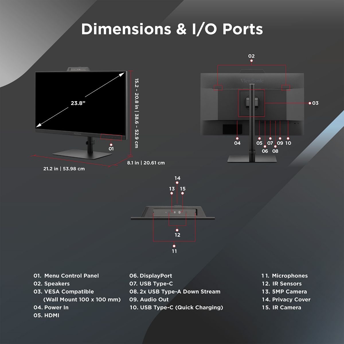 ViewSonic VG2441V 24 Inch 1080p IPS Video Conferencing Monitor with Integrated Windows Hello Certified IR 5MP Webcam, Built-in Microphone, Advanced