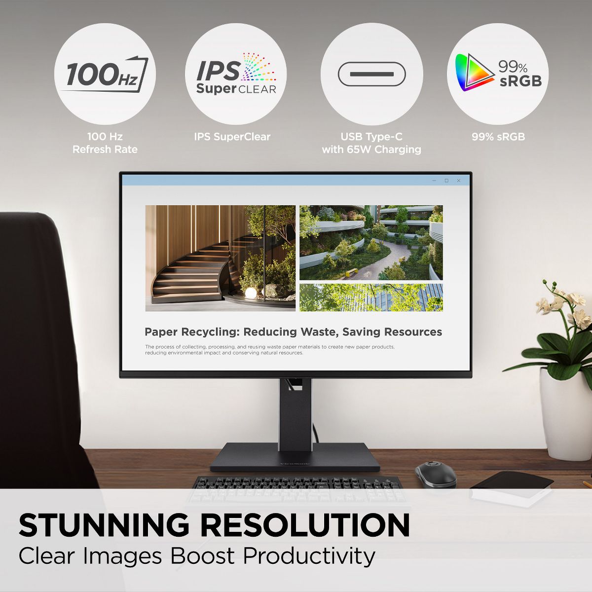The VG2452 is a 24” FHD (1920 x 1080) USB-C monitor designed for business and home use. It features HDMI, DisplayPort, USB-C, and USB Type-A inputs, making connectivity simple. Simplify your work with just one cable that provides audiovisual, data and up to 65W power transfer. The monitor offers a 100Hz refresh rate, Eye ProTech+ technology, and various ViewMode presets for enhanced performance and comfortable viewing. Effortlessly personalize your workspace with a VESA-compatible mount, allowing easy adjustments for ergonomic multitasking. Reflecting ViewSonic's commitment to sustainability, this monitor is designed for energy efficiency and features a compact build with a laser-textured finish, made from sustainable materials. It also comes in FSC-certified, 100% recyclable packaging that minimizes single-use materials.