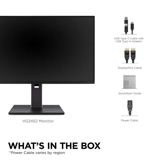 The VG2452 is a 24” FHD (1920 x 1080) USB-C monitor designed for business and home use. It features HDMI, DisplayPort, USB-C, and USB Type-A inputs, making connectivity simple. Simplify your work with just one cable that provides audiovisual, data and up to 65W power transfer. The monitor offers a 100Hz refresh rate, Eye ProTech+ technology, and various ViewMode presets for enhanced performance and comfortable viewing. Effortlessly personalize your workspace with a VESA-compatible mount, allowing easy adjustments for ergonomic multitasking. Reflecting ViewSonic's commitment to sustainability, this monitor is designed for energy efficiency and features a compact build with a laser-textured finish, made from sustainable materials. It also comes in FSC-certified, 100% recyclable packaging that minimizes single-use materials.