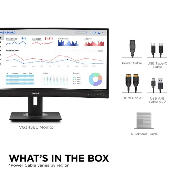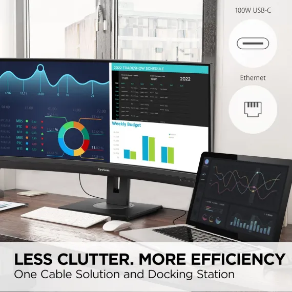 Featuring an immersive ultra-wide 34” curved screen with a design to boost productivity and maximize output, the ViewSonic VG3456C is a docking monitor that transforms your desktop into a streamlined and efficient workspace. With WQHD 3440 x 1440 resolution, the VG3456C delivers 2.4 times more pixels than standard Full HD monitors, giving users more detail for enhanced productivity. A 21:9 aspect ratio provides extra screen real estate so users can display more content, while a 1500R curved screen creates a more immersive viewing experience and reduces eye strain by bringing the far edges of the monitor closer. Enjoy a reliable network connectivity with the integrated Ethernet port while the latest USB Type-C connectivity provides up to 100W power delivery to your laptop. That’s not all, the integrated USB hub also provides single-cable simplicity for connecting and charging your peripherals and accessories.