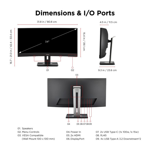 Streamline your setup and see the bigger picture with the ViewSonic® VG3456CA USB-C docking monitor. Save hundreds with a built-in docking station that includes USB-C connectivity with 100W power delivery, an RJ45 Ethernet port, and an integrated USB hub that makes it easy to connect the latest laptops and systems. This 34" curved ultrawide monitor offers expansive screen space with a UWQHD 3440x1440 resolution. Its 21:9 aspect ratio provides additional workspace, allowing you to display more content simultaneously - without the bezel gap that can be typically found in dual-monitor setups. The immersive 1500R curvature enhances viewing comfort and reduces eye strain by mimicking the natural curvature of the human eye. Elevate your productivity and unlock more screen space with the VG3456CA USB-C monitor today.