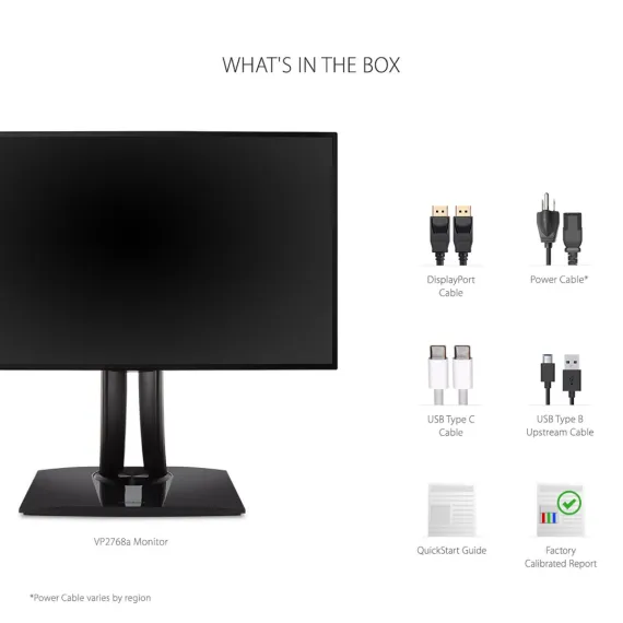 The VP2768a is a 27 Quad HD monitor that delivers color accuracy crucial for professional applications. With a sleek frameless design and edge-to-edge SuperClear IPS panel, this monitor provides an incredible viewing experience ideal for content creation and enterprise workstations. USB-C connectivity helps to simply your workspace by delivering audio, video, data and up to 90W of power delivery over a single universal cable. In addition, DisplayPort out enables seamless daisy chaining to a second monitor. To ensure precise, uniform color, each of our monitors is factory calibrated to deliver an amazing Delta E<2 value for superior color accuracy. A 14-bit 3D look-up table generates a stunningly smooth palette of 4.39 trillion colors. Add to that 6-axis color adjustment functionality, and this monitor provides the ultimate color processing capability for professional applications.