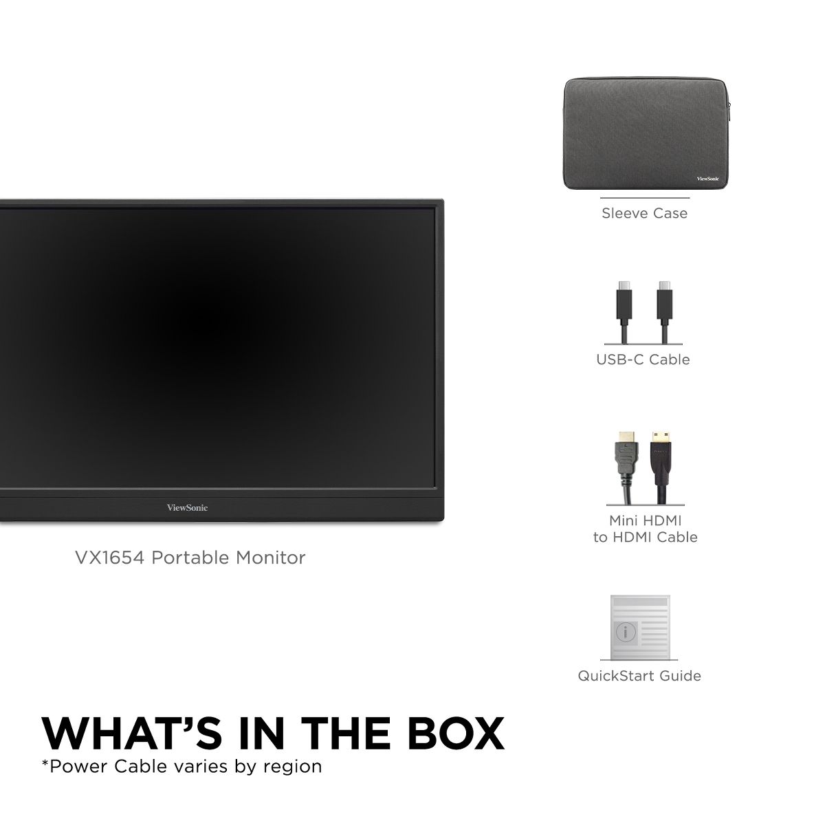 Take portable gaming to the next level with the ViewSonic VX1654 15.6" portable monitor. Featuring a stunning anti-glare Full HD display, powerful 144Hz refresh rate and AMD FreeSyncTM technology, the VX1654 portable monitor harnesses all the specs of a desktop setup for on-the-go gaming. Experience crisp graphics, tear-free visuals, and a responsive gameplay experience from just about anywhere. When you’re done playing, use the VX1654 portable monitor with your laptop or tablet to help double your screen space and turbocharge your productivity. USB-C connectivity means that users can connect their favorite consoles and enjoy video, audio, data, 60W of charging and two way power delivery with just a single cable. Users can connect even more of their favorite devices with a mini HDMI port. And with a weight of just 1.5 lbs. and a profile that’s slimmer than a deck of cards, this portable monitor slips easily into bags, briefcases or backpacks.