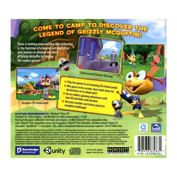 There is nothing more exciting than following in the footsteps of a legend. Come to camp to discover the legend of Grizzly McGuffin and play outrageously fun games in an amazing 3D virtual world where there are new adventures to be discovered every day!Features: Sprint around Dinosaur Raceway Run, jump, and swim through the 3D virtual world Adopt and take care of your very own pets Use your number and letter smarts to complete challenges Make the world your own with drawings, photos, and rewards you earn Hunt for hidden treasures above and below the sea Make the world your own with decorations youll earn or make along the way For players ages four to six