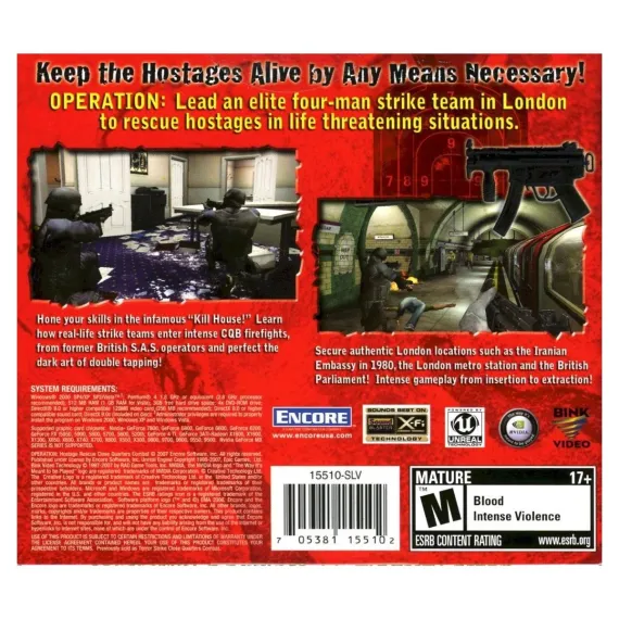 Operation: Hostage Rescue,?is a tense, accurate simulation of close quarters combat. Lead four-man teams in assaults on terrorist strongholds. Rescue hostages held at gunpoint. Recreate the deadly climax to the Iranian Embassy Siege of 1980. Fight battles in Britain's corridors of power in a daring rescue at the Houses of Parliament or tackle the nightmare scenario of a terrorist takeover of a subway system.