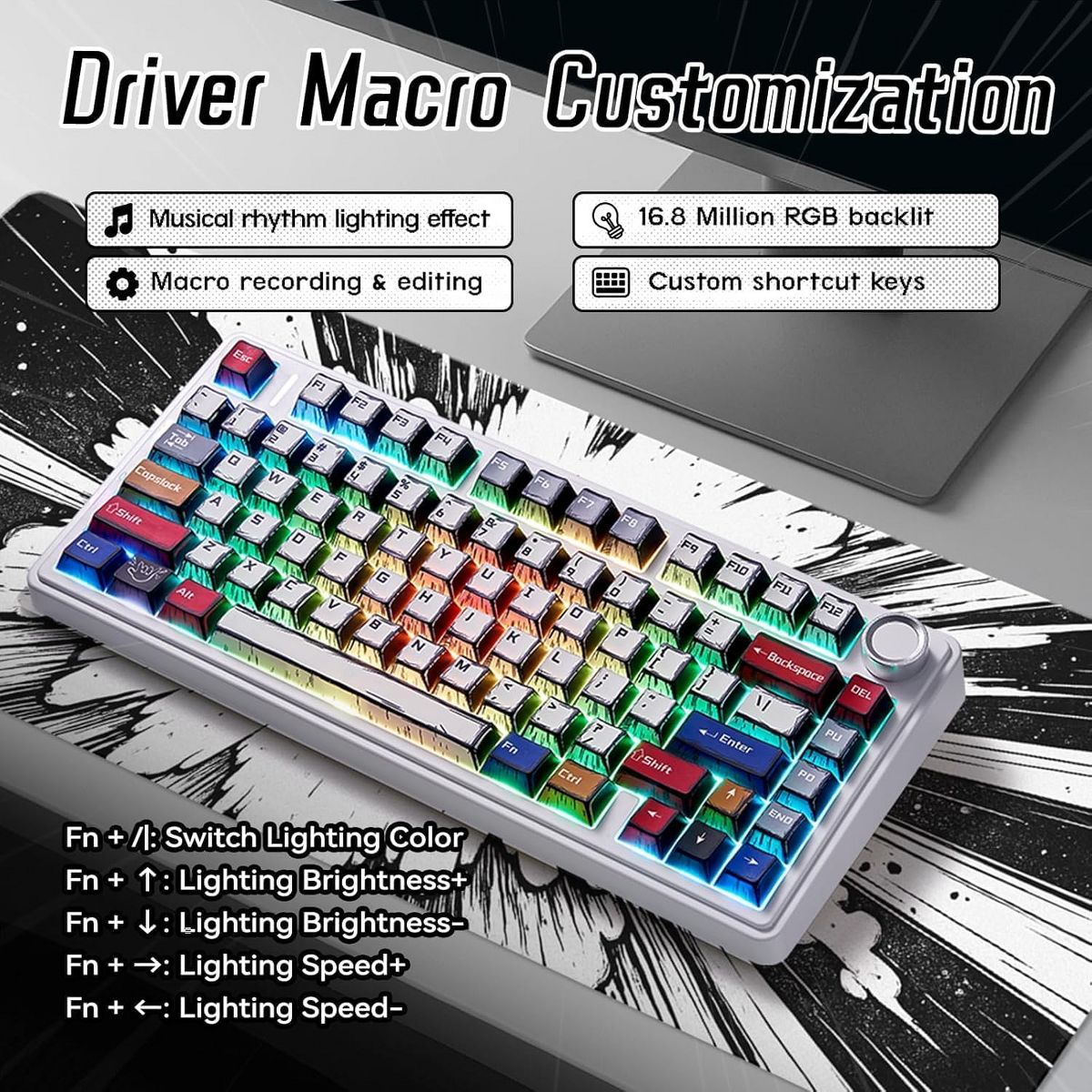 The F75 is a compact 75% keyboard with a gasket structure for soft, responsive typing. It features five-layer sound dampening, pre-lubed switches, and a 4000mAh battery. Supports Bluetooth, 2.4GHz, and USB-C, plus a control knob and hot-swappable keys.