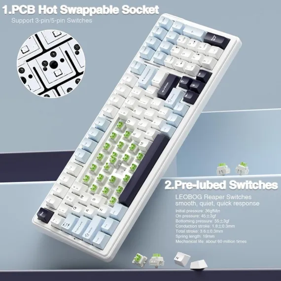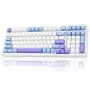 AULA F99 is a 96% layout keyboard with Bluetooth, USB, and 2.4GHz support. It includes RGB lighting, macro support, hot-swappable switches, PBT keycaps, and an 8000mAh battery. Suitable for gaming and work.