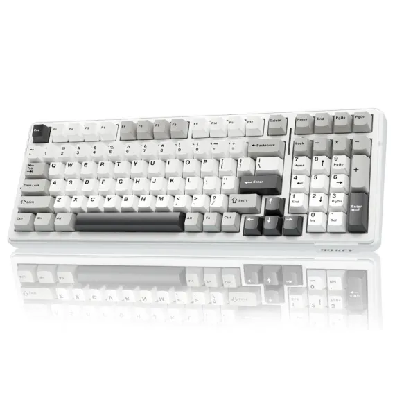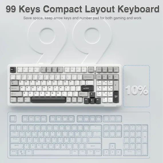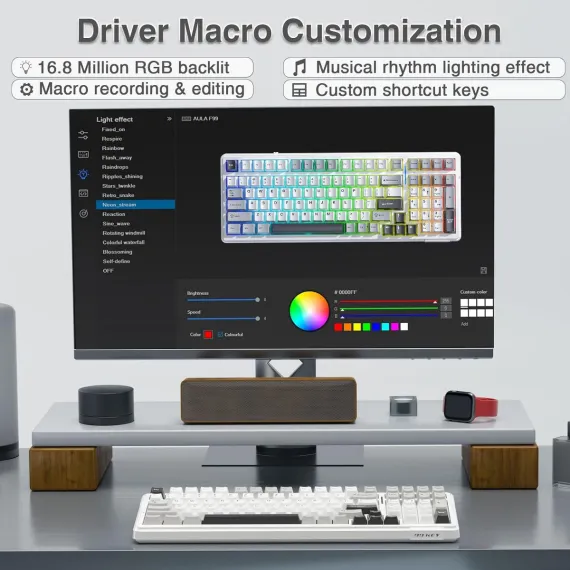 AULA F99 is a 96% layout keyboard with Bluetooth, USB, and 2.4GHz support. It includes RGB lighting, macro support, hot-swappable switches, PBT keycaps, and an 8000mAh battery. Suitable for gaming and work.