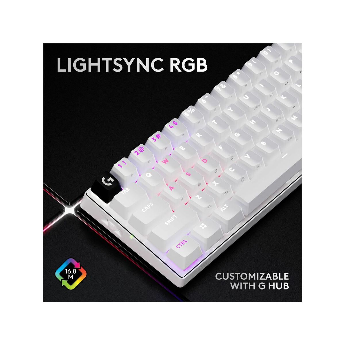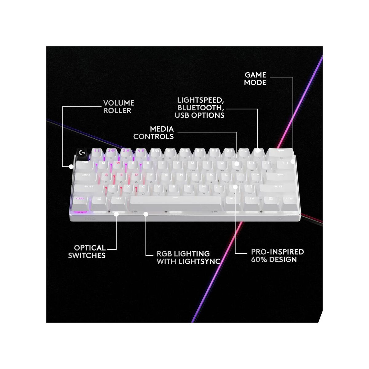 Designed with input from hundreds of the world's top esports athletes, the PRO X 60 LIGHTSPEED gaming keyboard is Logitech G's first 60% keyboard. Take control of every key in G HUB with KEYCONTROL and 5 customizable layers for the ultimate command center. Play your way with dual-shot PBT keycaps and GX optical switch options: tactile or linear. Seamlessly connect using Bluetooth, USB, or unleash speed and reliability with the performance of LIGHTSPEED wireless. Win in style with LIGHTSYNC customizable RGB and 3 keyboard colorways: Black, White, or Pink. Compact control. Zero compromises.