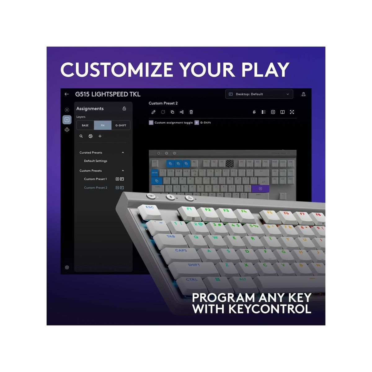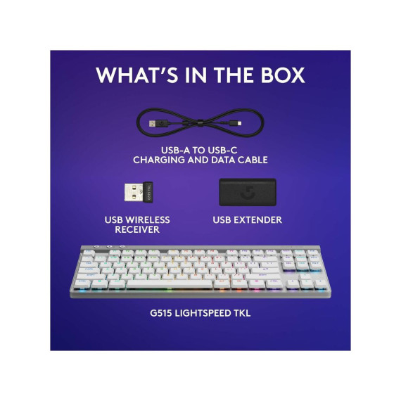Ultra-thin 22 mm design meets high-performance engineering with Logitech G515 LIGHTSPEED TKL wireless gaming keyboard.Suit your way of play with tri-mode connectivity featuring LIGHTSPEED wireless, Bluetooth, and wired data mode. LIGHTSPEED wireless offers 1 ms report rate and 2:1 pairing with compatible mice using a single USB.Low-profile GL mechanical switches are factory-lubed for faster actuation, available in tactile and linear.Double-shot PBT keycaps and sound dampening layered construction offer durability and accuracy for a superior experience visually and in play.Customize play, create themes and sync other Logitech G gear with LIGHTSYNC RGB in G HUB.Map any key with KEYCONTROL for a personalized command center.