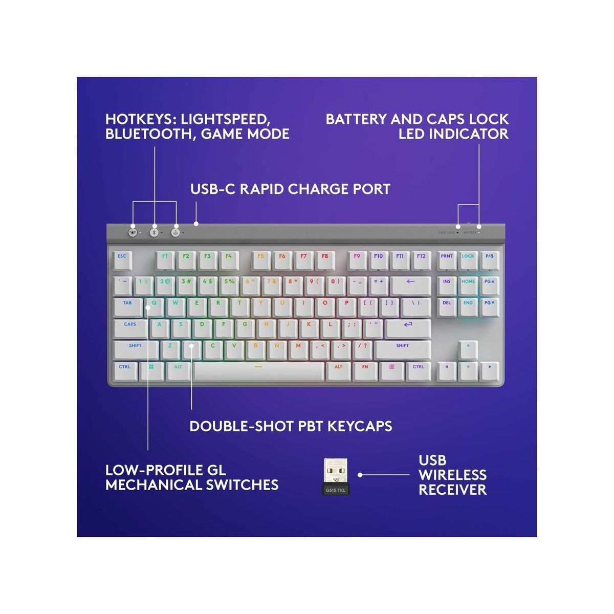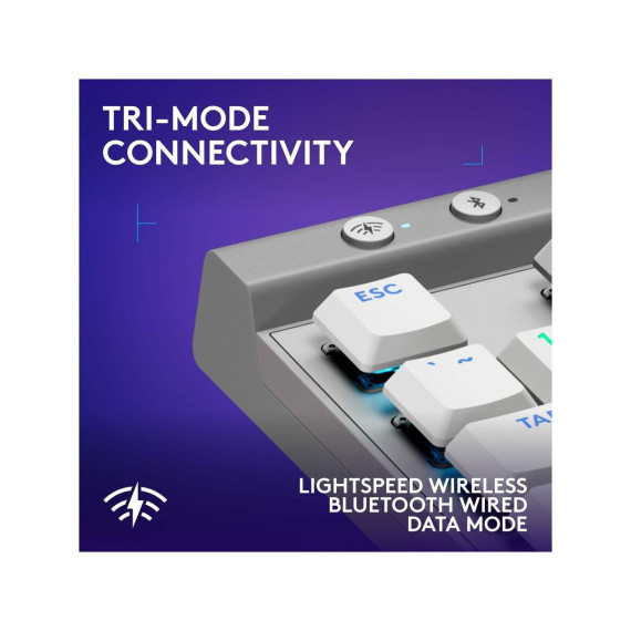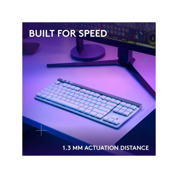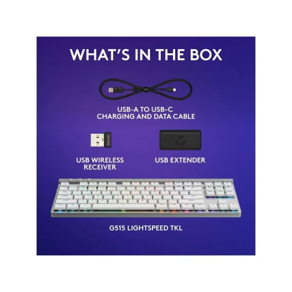 Ultra-thin 22 mm design meets high-performance engineering with Logitech G515 LIGHTSPEED TKL wireless gaming keyboard.Suit your way of play with tri-mode connectivity featuring LIGHTSPEED wireless, Bluetooth, and wired data mode. LIGHTSPEED wireless offers 1 ms report rate and 2:1 pairing with compatible mice using a single USB.Low-profile GL mechanical switches are factory-lubed for faster actuation, available in tactile and linear.Double-shot PBT keycaps and sound dampening layered construction offer durability and accuracy for a superior experience visually and in play.Customize play, create themes and sync other Logitech G gear with LIGHTSYNC RGB in G HUB.Map any key with KEYCONTROL for a personalized command center.