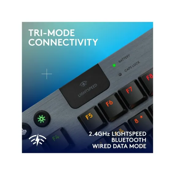 G915 X LIGHTSPEED TKL low-profile wireless gaming keyboard offers the latest innovations in gaming technology with meticulously crafted design and curated materials.Experience more speed with tri-mode connectivity. Choose from best-in-class 2.4 GHz LIGHTSPEED wireless, Bluetooth, and wired data mode. Play even faster with low-profile GL switches designed with 1.3 mm actuation rate.KEYCONTROL redefines industry innovation and allows you to set up to 15 functions per key. Soft touch media keys and cast iron volume roller provide quick access control.Premium materials complement design with double-shot PBT keycaps and premium machinery elevate the typing experience.Only 23 mm high, the G915 X LIGHTSPEED TKL provides speed and durability with an impossibly slim, tenkeyless aesthetic.Engineered for creative customization, LIGHTSYNC RGB offers access to ~16.8 M colors to customize and unify all of your Logitech G gear through G HUB.