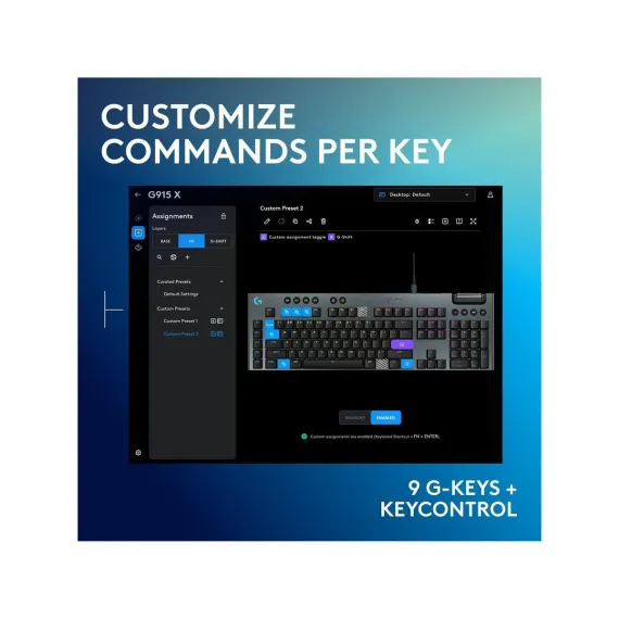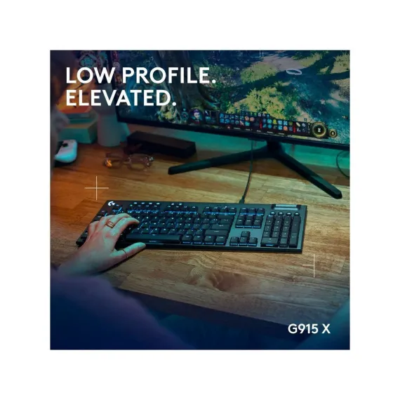 G915 X low-profile wired gaming keyboard offers the latest innovations in gaming technology with meticulously crafted design and curated materials.Experience more speed with low-profile GL switches designed with 1.3 mm actuation point.KEYCONTROL redefines industry innovation and allows you to set up to 15 functions per key. Soft touch media keys, 9 G-keys, and cast iron volume roller provide quick access control.Engineered for creative customization, LIGHTSYNC RGB offers access to ~16.8 M colors to customize and unify all of your Logitech G gear through G HUB.