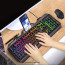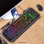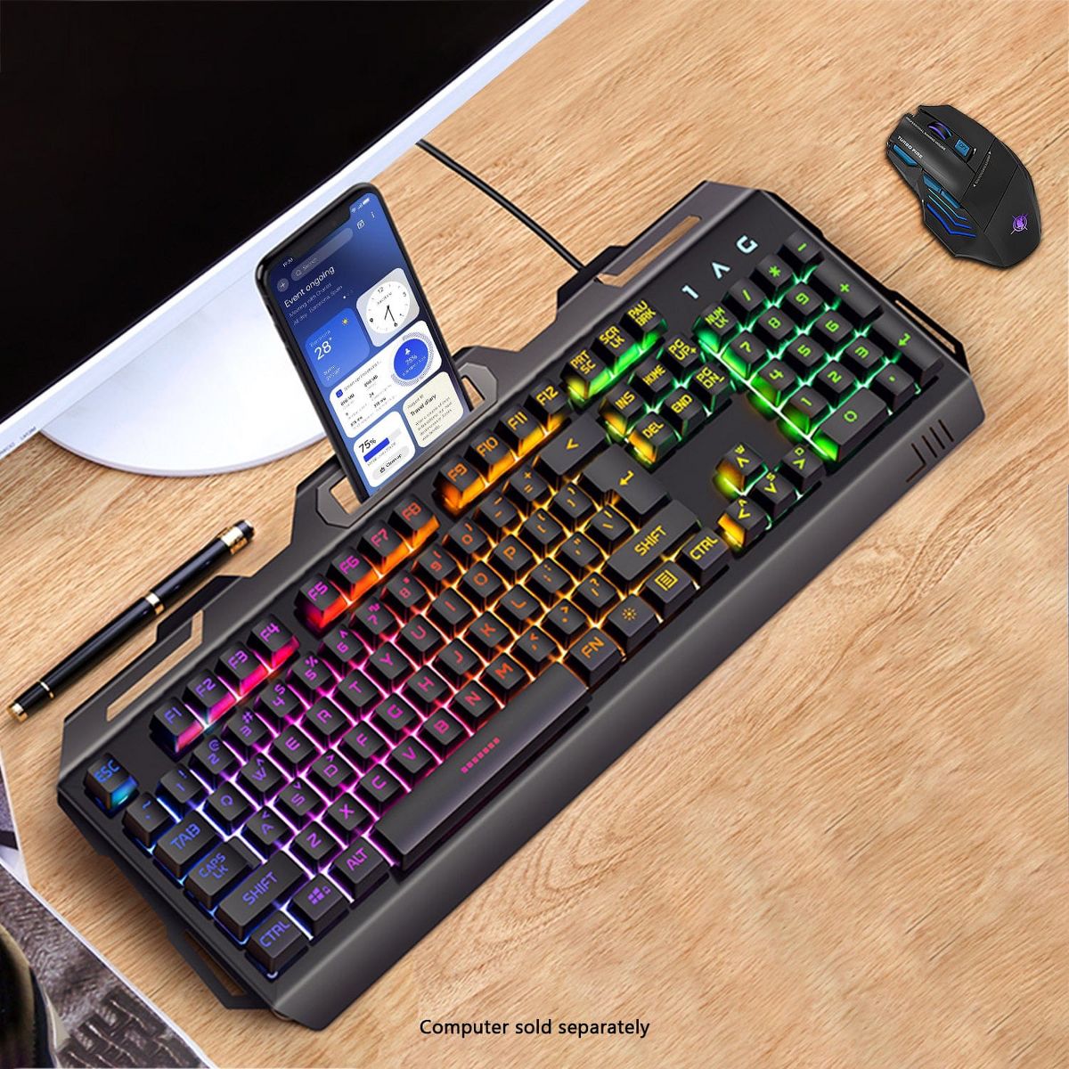 This Wired Gaming Keyboard & Mouse Combo features a full-size 104-key layout designed for responsive control and reliable performance. The metal panel construction adds durability and stability, while the RGB LED backlighting with multiple lighting effects enhances visibility and creates a vibrant gaming atmosphere. Multi-key anti-ghosting ensures accurate input during fast-paced gameplay, and the integrated phone holder supports convenient multitasking.