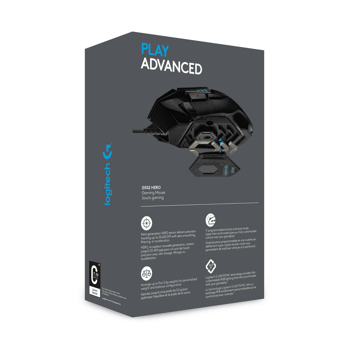 Your favorite high performance gaming mouse delivers more precise functionality than ever. Now, customize RGB lighting to match your style and environment or sync to other Logitech G products. G502 High Performance Gaming Mouse features our next generation HERO 25K optical sensor for maximum tracking accuracy and precision. No matter your gaming style, it’s easy to tweak G502 HERO to match your requirements, with custom profiles for your games, adjustable sensitivity from 200 up to 16,000 DPI*, and tunable weight system that allows for tuning and balancing of up to five 3.6g weights for just the right balance and feel.