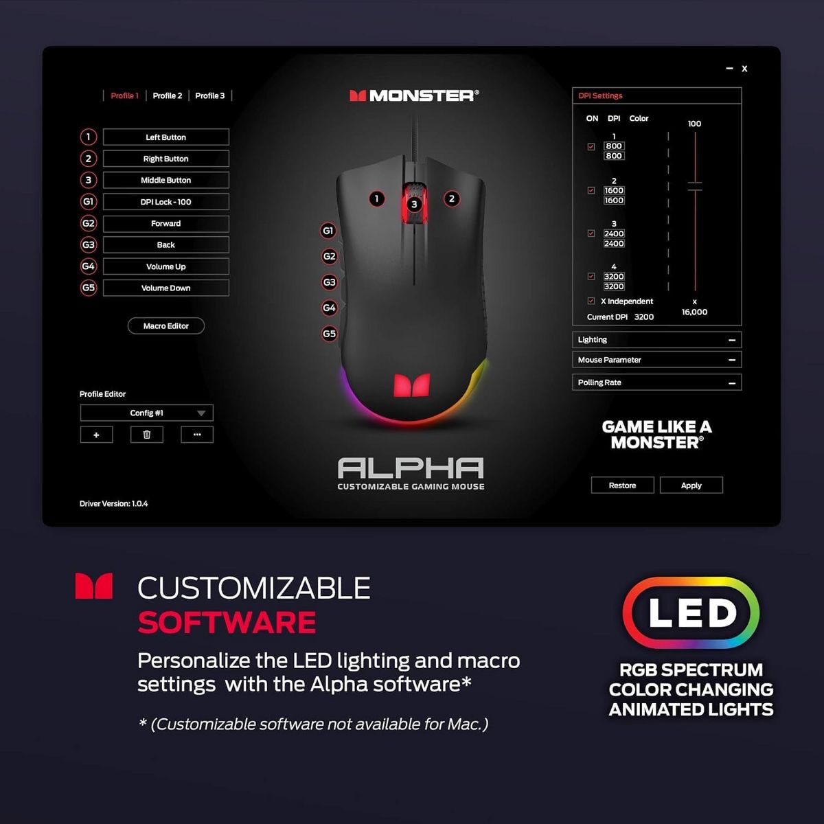SOFTWARE AVAILABLE: The Monster computer gaming mouse comes with a dedicated software that provides the ultimate control of your gaming experience. Choose between LED lighting effects, DPI presets, as well as the capability to save up to 3 different control profiles for quick and convenient swapping between games. Software is not compatible with Mac (macOS). TRUE 16,000 DPI: Equipped with a PMW3380 optical sensor, this led optical gaming mouse operates with one of the fastest optical sensors on the market. The sensor is adjustable in single DPI increments to allow for high and low sensitivity control based on your in-game need. Optimal DPI configurations and extra DPI settings are fully customizable by software up to 16,000 DPI. This level of control provides exceptional accuracy and tracking capabilities. CUSTOMIZABLE CONTROLS & BUTTONS: Customize your control scheme based on your playstyle and gaming preferences via the included software for quick and easy command customization. This mouse for gaming includes 9 additional swappable side buttons for optimal control and tactical advantage. RGB CHANGING LED LIGHTS: Our RGB gaming mouse boasts color changing lights that add an ambient glow to your gaming experience. The dynamic RGB lighting smoothly transitions to create an unparalleled atmosphere. Use the included software to customize your unique color profile and to show off your personality! ERGONOMIC DESIGN: This Monster gaming wired mouse is designed for intensive gaming & fits perfectly in the curve of your palm and allows for hours of comfortable and competitive gaming. Never doubt the combination of comfort mixed with performance that this compact gaming mouse offers to all gamers.