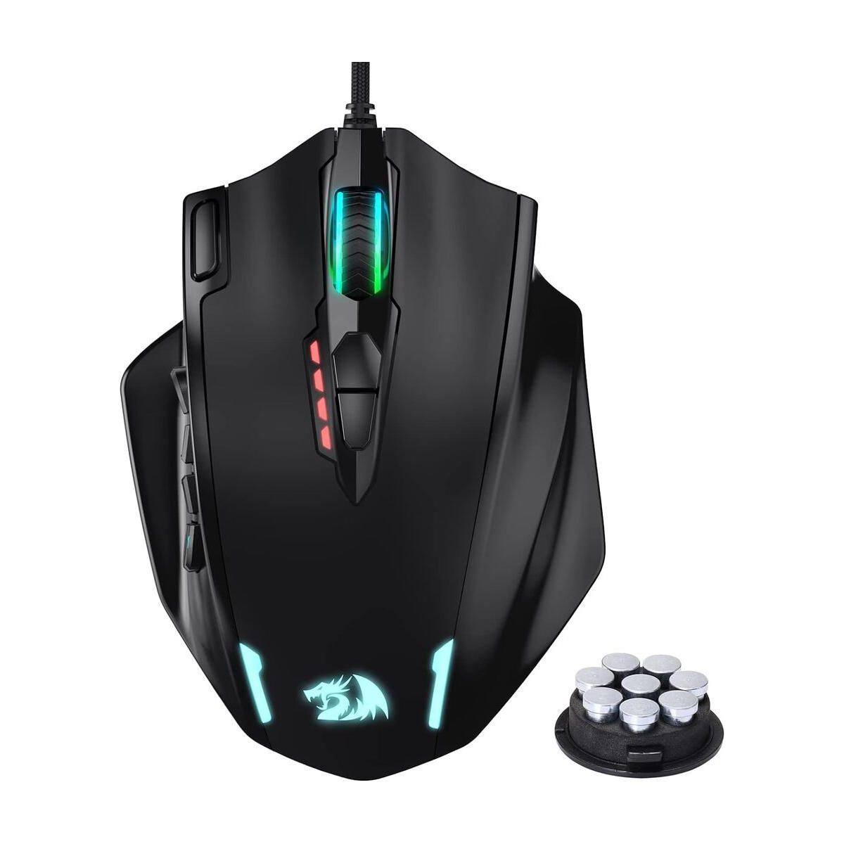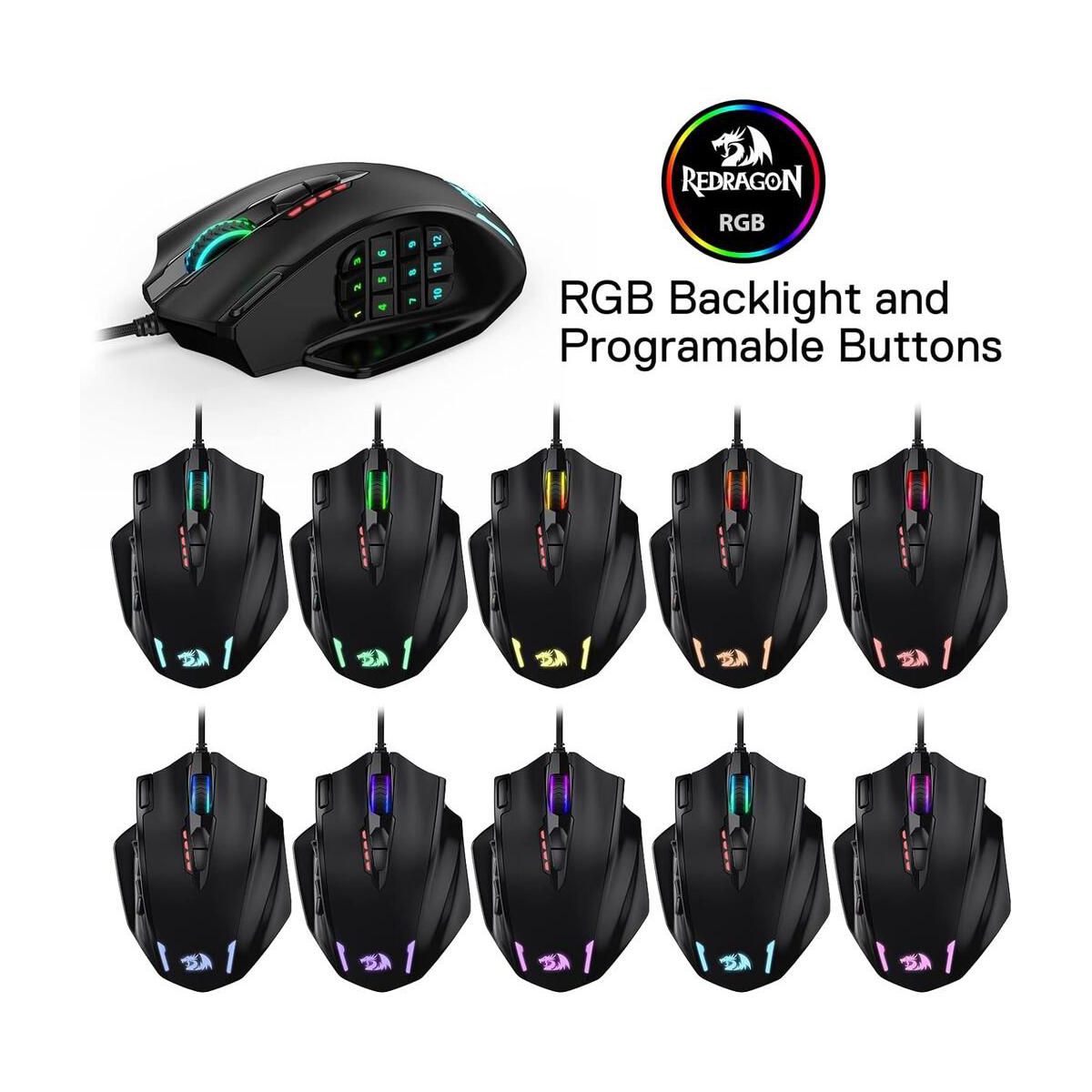 The Redragon M908 IMPACT MMO Gaming Mouse is a high-precision wired mouse designed for serious gamers, offering up to 12,400 DPI for pinpoint accuracy. It features 18 programmable buttons, including 12 conveniently placed side buttons, ideal for MMO games. With a weight tuning cartridge, five customizable user profiles, and 16.8 million LED color options, it delivers personalized performance and style.