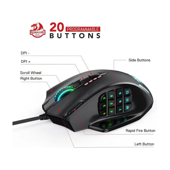 The Redragon M908 IMPACT MMO Gaming Mouse is a high-precision wired mouse designed for serious gamers, offering up to 12,400 DPI for pinpoint accuracy. It features 18 programmable buttons, including 12 conveniently placed side buttons, ideal for MMO games. With a weight tuning cartridge, five customizable user profiles, and 16.8 million LED color options, it delivers personalized performance and style.
