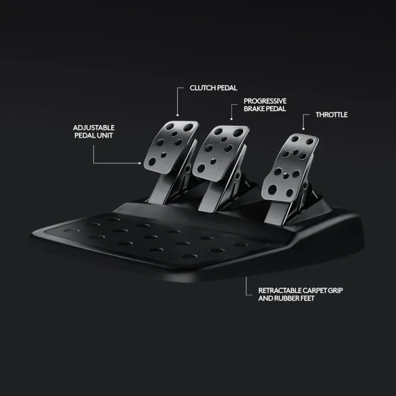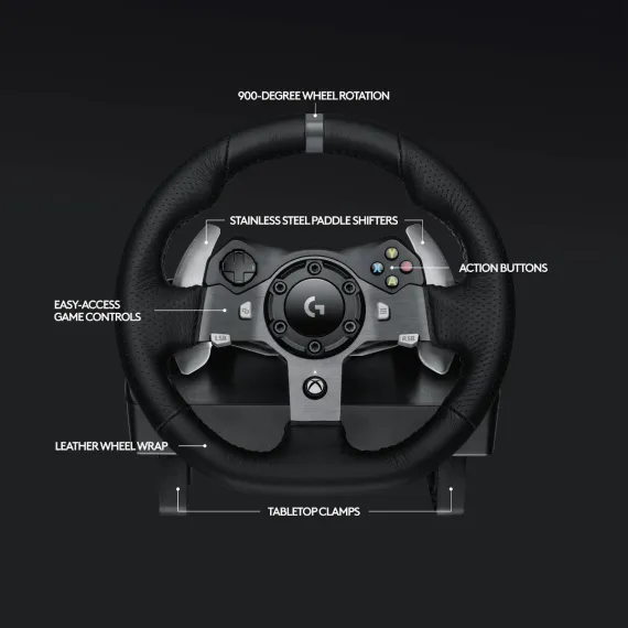 G920 Driving Force is the definitive sim racing wheel for the latest Xbox Series X|S, Xbox One™ and PC titles. With realistic dual-motor force feedback and helical gearing for quiet, smooth steering. On-wheel controls and paddle shifters are easy to access so you can make crisp, precise gear transitions. The separate pedal unit gives you natural, responsive control, with a nonlinear brake pedal that mimics the feel of high-performance vehicles. Driving Force is built for comfort and durability with hand-stitched leather and stainless steel components. Built-in clamps and bolt points keeps Driving Force mounted securely to a table or racing rig, minimizing shifting or wobbling during aggressive maneuvers.