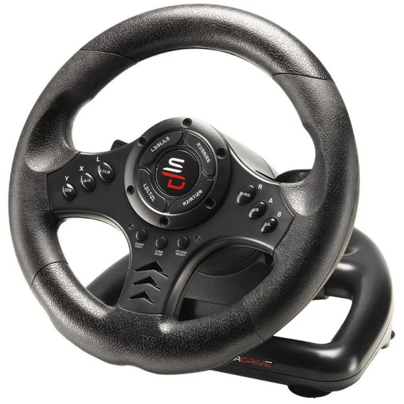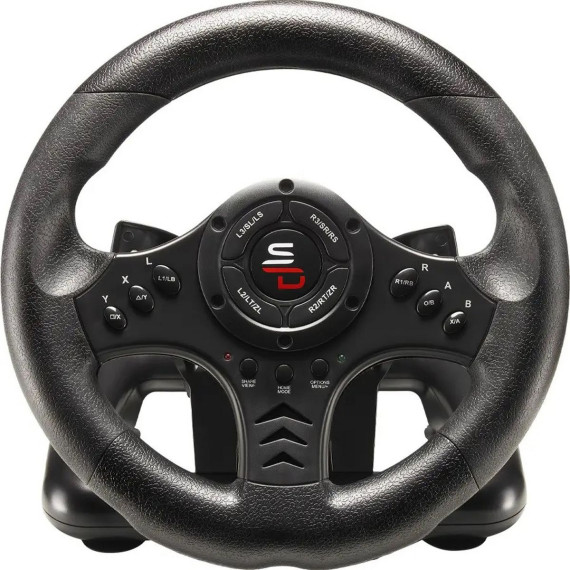 The SV450 Universal Steering Wheel from SUPERDRIVE offers you a playful 180° rotation angle that adapts to your driving habits. It is fully programmable and has 3 levels of sensitivity adjustable directly from the steering wheel. Super practical, the SV450 racing wheel is equipped with suction cups to be fixed on a desk or any flat surface. Compact at only 9 in. (23 cm), it is easy to store._