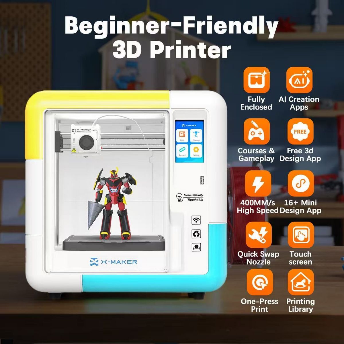 Unlock endless creativity with this fully enclosed 3D printer designed for kids, beginners, and families. A safe, quiet, and user-friendly choice for home learning and early STEM education, it features a 3.5-inch color touch screen, an auto-leveling bed, 15 built-in design apps, and 0.05 mm printing precision. With noise under 50 dB, it makes a fun and educational gift for young creators and curious beginners. 【Available Options】Standard Printer (includes 1 filament); AI Printer (includes 1 filament); AI Printer + 4 Filaments; Standard Printer + 8 Filaments. Filament quantity varies by selected option—please review before checkout.